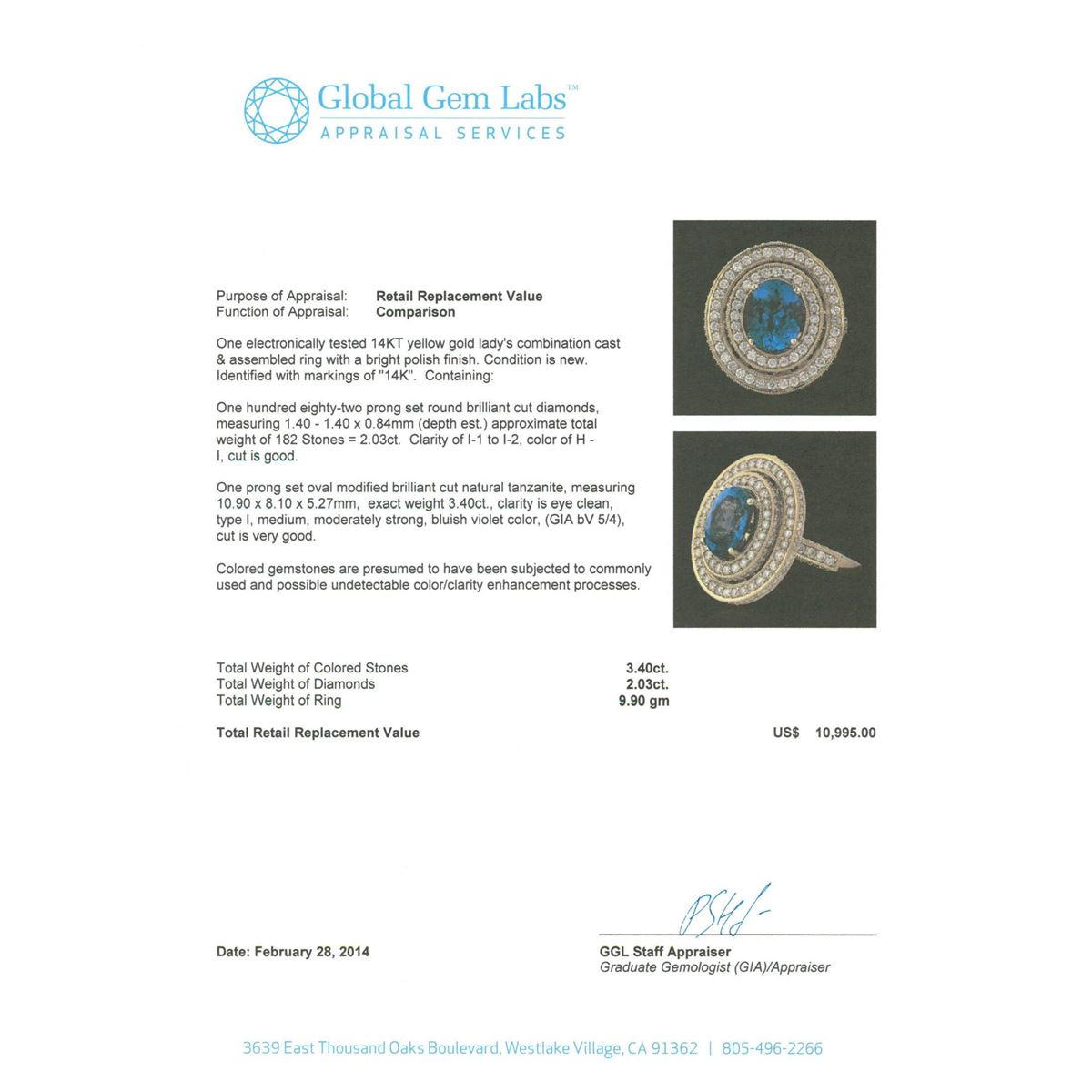 One electronically tested 14KT yellow gold Ladies combination cast & assembled ring with a bright polish finish. Condition is new. Identified with markings of "14K". Containing: One Hundred Eighty-Two prong set round brilliant cut diamonds, measuring 1.40 - 1.40 x 0.84mm (depth est.) approximate. Total Weight of 182 Stones = 2.03ct. Clarity: I-1 to I-2. Color: H - I, Cut is Good. One prong set oval modified brilliant cut natural tanzanite, measuring 10.90 x 8.10 x 5.27mm, exact weight 3.40ct., clarity is eye clean, type I, medium, moderately strong, bluish violet color, (GIA bV 5/4), cut is very good. Colored gemstones are presumed to have been subjected to commonly used and possible undetectable color/clarity enhancement processes. Total Weight of Colored Stones 3.40ct. Total Weight of Diamonds 2.03ct. Total Weight of Ring 9.90 grams. GGL Appraised at $10,995.00.