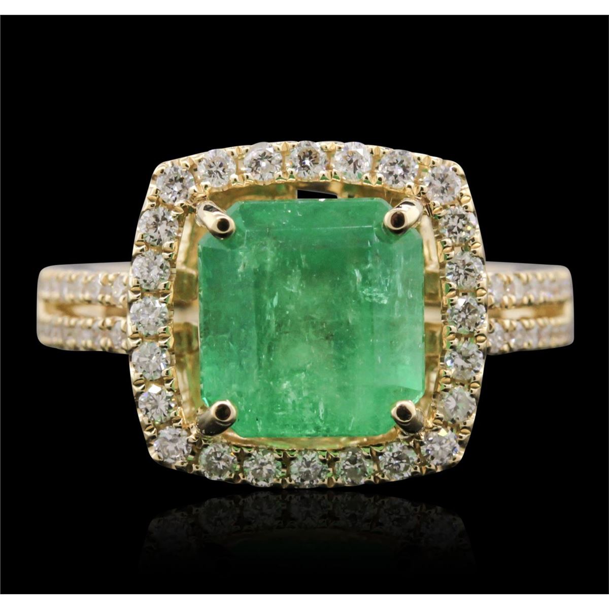 One electronically tested 14KT yellow gold Ladies combination cast & assembled ring with a bright polish finish. Condition is new. Identified with markings of "14K". Containing: One prong set emerald standard step cut natural emerald, measuring 9.32 x 8.76 x 5.70mm, approximate weight of 3.42ct., clarity is moderately included, type III, medium, moderately strong, green color, (GIA G 5/4), cut is good. Fifty-Two prong set round brilliant cut diamonds, measuring 1.50 - 1.30 x 0.84mm (depth est.) approximate total weight of 52 Stones = 0.52ct. Clarity: I-1 to I-2. Color: I - J, Cut is Good. Colored gemstones are presumed to have been subjected to commonly used enhancement processes. All diamonds and colored gemstones are graded in the mounting, unless otherwise stated. Total Weight of Colored Stones 3.42ct. Total Weight of Diamonds 0.52ct. Total Weight of Ring 6.90 grams. GGL Appraised at $9,760.00.