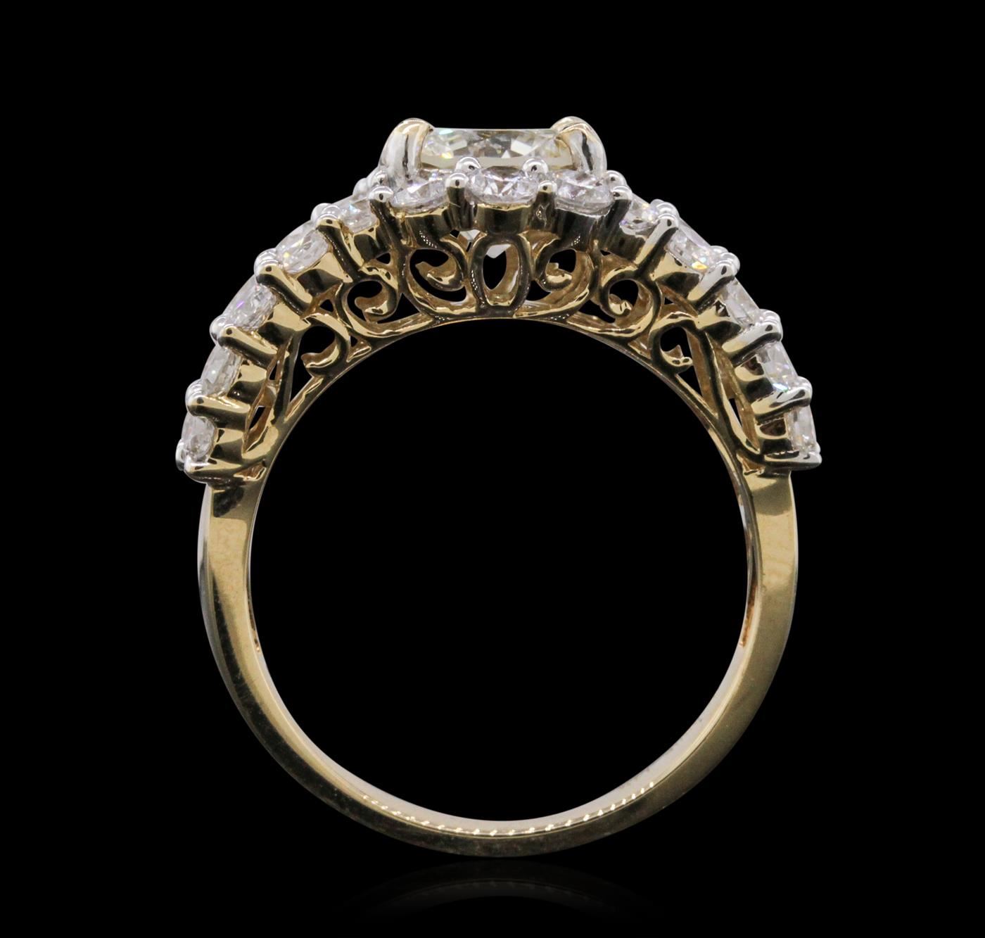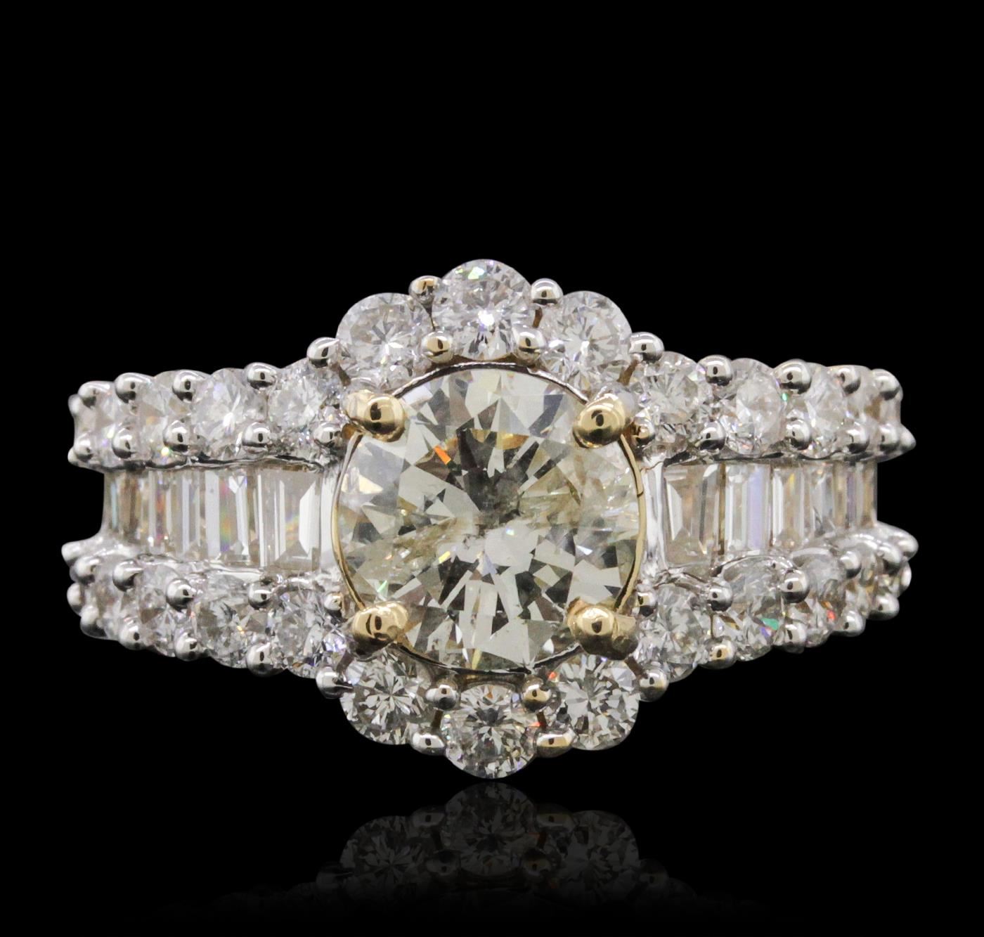 One electronically tested 14KT yellow gold ladies combination cast & assembled engagement ring with a flat shank with a bright polish finish. Identified with markings of "14K". Condition is new. Containing: One prong set round brilliant cut diamond, measuring 7.66 - 7.58 x 4.65mm (depth est.) approximate weight of 1.65ct. Clarity: I-2. Color: L, Cut is Good. Twenty-Six prong set round brilliant cut diamonds, measuring 2.40 - 2.20 x 1.38mm (depth est.) approximate total weight of 26 Stones = 1.16ct. Clarity: SI-1 to I-1. Color: I, Cut is Good. Twelve channel set baguette cut diamonds, measuring from 2.00 x 1.30 x 1.11mm (depth est.) to 2.90 x 2.00 x 1.70mm (depth est.) approximate total weight of 12 Stones = 0.62ct. Clarity: VS-2. Color: J - K, Cut is Good. All diamonds are graded in the mounting, unless otherwise stated. Total Weight of Diamonds 3.43ct. Total Weight of Ring 6.20 grams. GGL Appraised at $18,110.00.