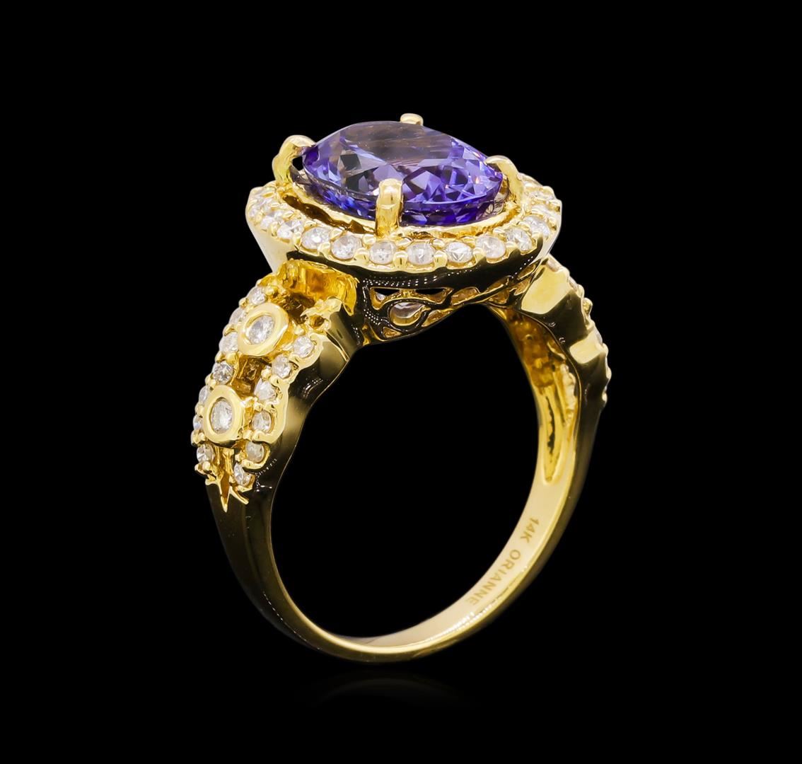 One electronically tested 14KT yellow gold ladies combination cast & assembled tanzanite and diamond ring with a split shank with a bright polish finish. Identified with markings of "14K". Condition is new. Containing: One prong set oval modified brilliant cut natural tanzanite, measuring 10.80 x 8.51 x 5.49mm, approximate weight of 3.43ct., clarity is eye clean, type I, medium, moderately strong, violet color, (GIA V 5/4), cut is good. Four bezel set round brilliant cut diamonds, measuring 1.40 - 1.40 x 0.84mm (depth est.) approximate total weight of 4 Stones = 0.04ct. Clarity: I-1 to I-2. Color: J - K, Cut is Good. Fifty-Two prong set round brilliant cut diamonds, measuring 1.10 - 1.10 x 0.66mm (depth est.) approximate total weight of 52 Stones = 0.25ct. Clarity: I-1 to I-2. Color: J - K, Cut is Good. Colored gemstones are presumed to have been subjected to commonly used enhancement processes. All diamonds and colored gemstones are graded in the mounting, unless otherwise stated. Total Weight of Colored Stones 3.43ct. Total Weight of Diamonds 0.29ct. Total Weight of Ring 5.80 grams. GGL Appraised.