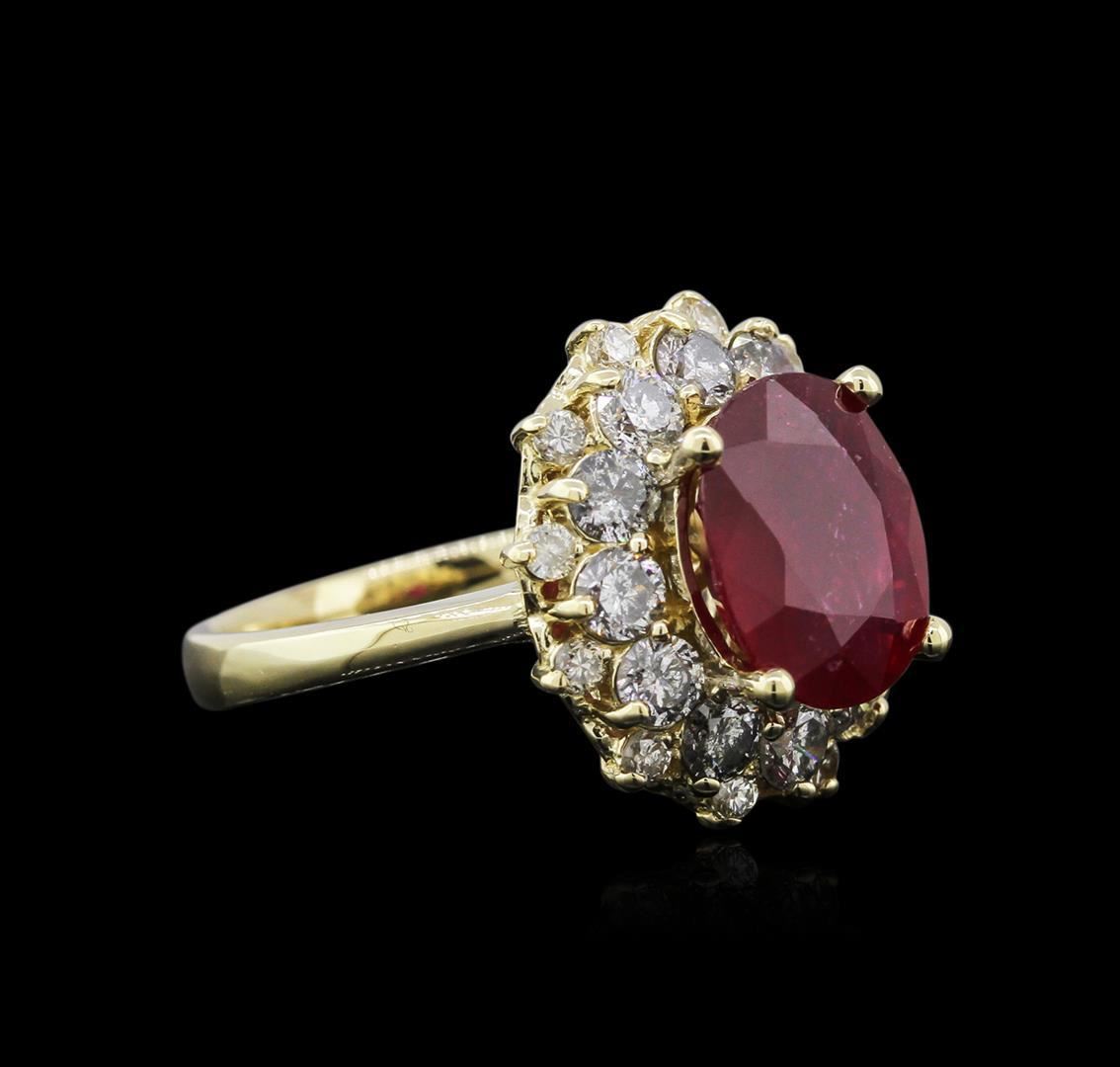 One electronically tested 14KT yellow gold ladies cast ruby and diamond ring with a bright polish finish. Identified with markings of "K14". Condition is new. Containing: One prong set oval modified brilliant cut natural ruby, measuring 10.79 x 8.88 x 4.41mm, approximate weight of 3.55ct., clarity is heavily included, type II, medium dark, very slightly brownish, strongly purplish red color, (GIA stpR 6/3), cut is good. Twelve prong set round brilliant cut diamonds, measuring 3.00 - 3.00 x 1.80mm (depth est.) approximate total weight of 12 Stones = 1.19ct. Clarity: I-2 to I-3. Color: I - J, Cut is Good. Twelve prong set round brilliant cut diamonds, measuring 1.00 - 7.00 x 1.70mm (depth est.) approximate total weight of 12 Stones = 1.99ct. Clarity: SI-2 to I-1. Color: J - K, Cut is Good. Diamonds and colored gemstones are graded in the mounting, unless otherwise stated. Colored gemstones are presumed to have been subjected to commonly used enhancement processes. Total Weight of Colored Stones 3.55ct. Total Weight of Diamonds 3.18ct. Total Weight of Ring 6.60 grams. GGL Appraised.