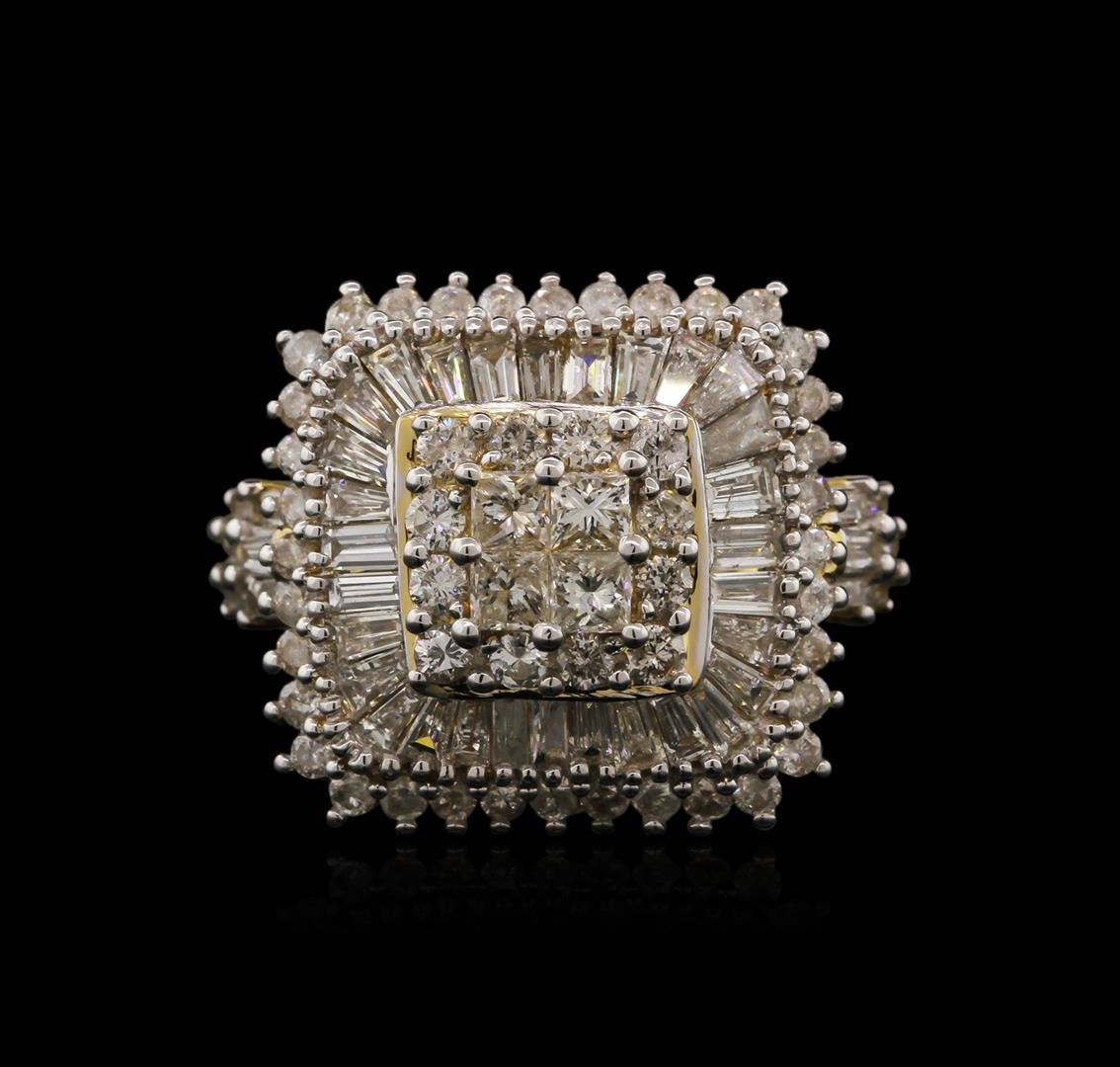 One electronically tested 14KT yellow gold ladies cast diamond ring with a bright polish finish. Identified with markings of "14K". Condition is new. Containing: Forty-Three channel set baguette cut diamonds, measuring 2.00. x 1.50 x 1.28mm (depth est.) approximate total weight of 43 Stones = 2.14ct. Clarity: SI-2 to I-2. Color: I - J, Cut is Good. Four prong set princess cut diamonds, measuring 2.50 x 2.50 x 1.88mm (depth est.) approximate total weight of 4 Stones = 0.37ct. Clarity: SI-2 to I-1. Color: I - J, Cut is Good. Forty-Eight prong set round brilliant cut diamonds, measuring 1.50 - 1.50 x 0.90mm (depth est.) approximate total weight of 48 Stones = 1.09ct. Clarity: I-1 to I-2. Color: I - J, Cut is Good. Diamonds are graded in the mounting, unless otherwise stated. Total Weight of Diamonds 3.60ct. Total Weight of Ring 5.90 grams. GGL Appraised at $4,960.00.