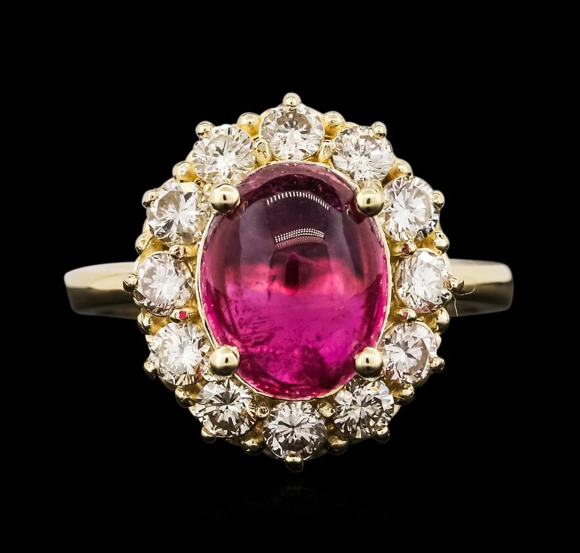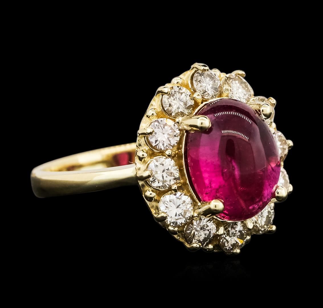 One electronically tested 14KT yellow gold ladies cast rubellite tourmaline and diamond ring with a bright polish finish. The featured rubellite tourmaline is set within a diamond bezel, completed by a two and one-half millimeter wide band. Identified with markings of "K14". Condition is new, good workmanship. Containing: One prong set oval cabochon cut natural rubellite, measuring 10.50 x 8.35 x 4.75mm, 6% bulge factor, approximate weight of 3.75ct., clarity is moderately included, type III, medium dark, moderately strong, slightly purplish red color, (GIA slpR 6/4), cut is good. Transmitting light with a minimum of distortion, transparent. Naturally occurring internal & external characteristics are present. Refractive index spot testing results of 1.62. This is a conclusive result for tourmaline. Graded in the setting. Twelve prong set round brilliant cut diamonds, measuring 2.70 - 2.60 x 1.59mm (depth est.) approximate total weight of 12 Stones = 0.91ct. Graded in the setting. Clarity: VS-2 to SI-2. Color: I - K. Total Weight of Colored Stones 3.75ct. Total Weight of Diamonds 0.91ct. Total Weight of Ring 5.41 grams. AIG Appraised at $5,545.00.