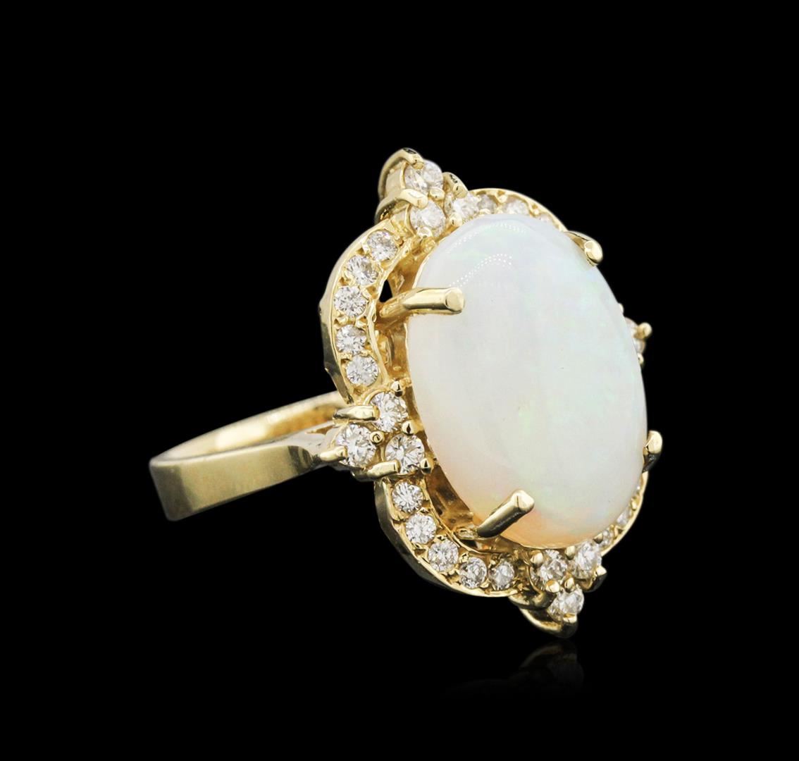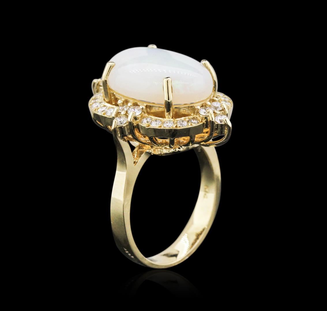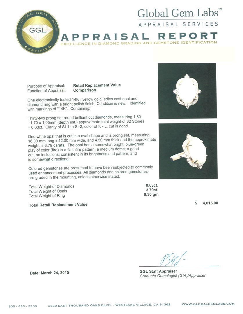 One electronically tested 14KT yellow gold ladies cast opal and diamond ring with a bright polish finish. Identified with markings of "14K". Condition is new. Containing: Thirty-Two prong set round brilliant cut diamonds, measuring 1.80 - 1.70 x 1.05mm (depth est.) approximate total weight of 32 Stones = 0.63ct. Clarity: SI-1 to SI-2. Color: K - L, Cut is Good. One white opal that is cut in a oval shape and is prong set, measuring 16.00 mm long x 12.00 mm wide, and 4.50 mm thick and the approximate weight is 3.79 carats. The opal has a somewhat bright, blue-green play of color (fire) in a flashfire pattern; a medium dome; a good cut; no inclusions; consistent in its brightness and pattern; and is somewhat directional. Colored gemstones are presumed to have been subjected to commonly used enhancement processes. All diamonds and colored gemstones are graded in the mounting, unless otherwise stated. Total Weight of Diamonds 0.63ct. Total Weight of Opals 3.79ct. Total Weight of Ring 9.30 grams. GGL Appraised at $4,015.00.