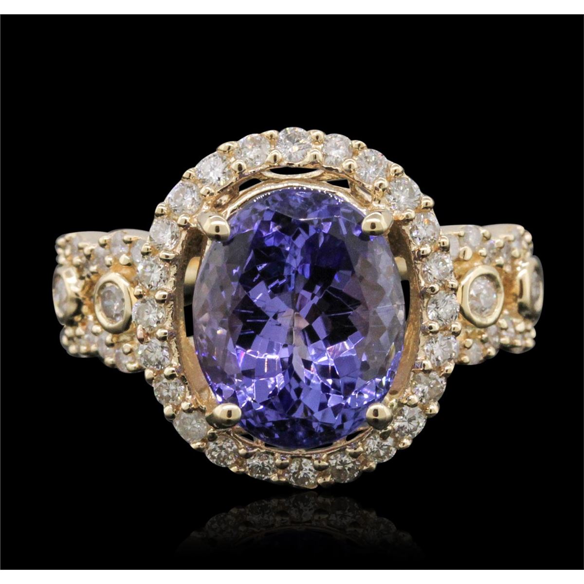 One electronically tested 14KT yellow gold ladies combination cast & assembled tanzanite and diamond ring with a split shank with a bright polish finish. Identified with markings of "14K". Condition is new. Containing: One prong set oval modified brilliant cut natural tanzanite, measuring 10.90 x 8.92 x 5.76mm, approximate weight of 3.79ct., clarity is eye clean, type I, medium, moderately strong, violet color, (GIA V 5/4), cut is good. Four bezel set round brilliant cut diamonds, measuring 1.40 - 1.40 x 0.84mm (depth est.) approximate total weight of 4 Stones = 0.04ct. Clarity: I-1 to I-2. Color: J - K, Cut is Good. Fifty-Two prong set round brilliant cut diamonds, measuring 1.10 - 1.10 x 0.66mm (depth est.) approximate total weight of 52 Stones = 0.25ct. Clarity: I-1 to I-2. Color: J - K, Cut is Good. Colored gemstones are presumed to have been subjected to commonly used enhancement processes. All diamonds and colored gemstones are graded in the mounting, unless otherwise stated. Total Weight of Colored Stones 3.79ct. Total Weight of Diamonds 0.29ct. Total Weight of Ring 5.30 grams. GGL Appraised at $7,595.00.