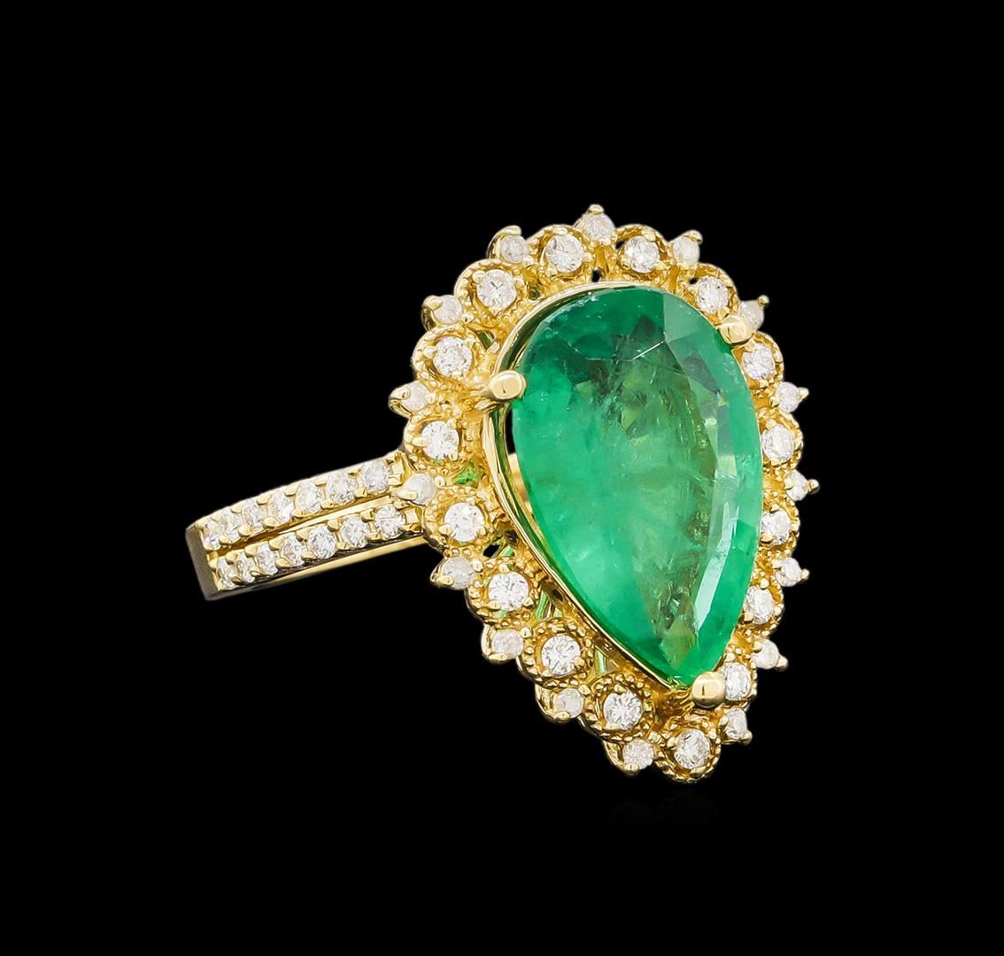 One electronically tested 14KT yellow gold ladies cast emerald and diamond ring with a bright polish finish. Identified with markings of "14K". Condition is new. Containing: One prong set pear modified brilliant cut natural emerald, measuring 15.00 x 9.00 x 5.20mm, approximate weight of 3.82ct., clarity is heavily included, type III, medium dark, moderately strong, green color, (GIA G 6/4), cut is good. Sixty-One prong set round brilliant cut diamonds, measuring 1.30 - 1.00 x 0.69mm (depth est.) approximate total weight of 61 Stones = 0.34ct. Clarity: SI-2 to I-2. Color: J, Cut is Good. Colored gemstones are presumed to have been subjected to commonly used enhancement processes. All diamonds and colored gemstones are graded in the mounting, unless otherwise stated. Total Weight of Colored Stones 3.82ct. Total Weight of Diamonds 0.34ct. Total Weight of Ring 6.50 grams. GGL Appraised at $6,455.00.