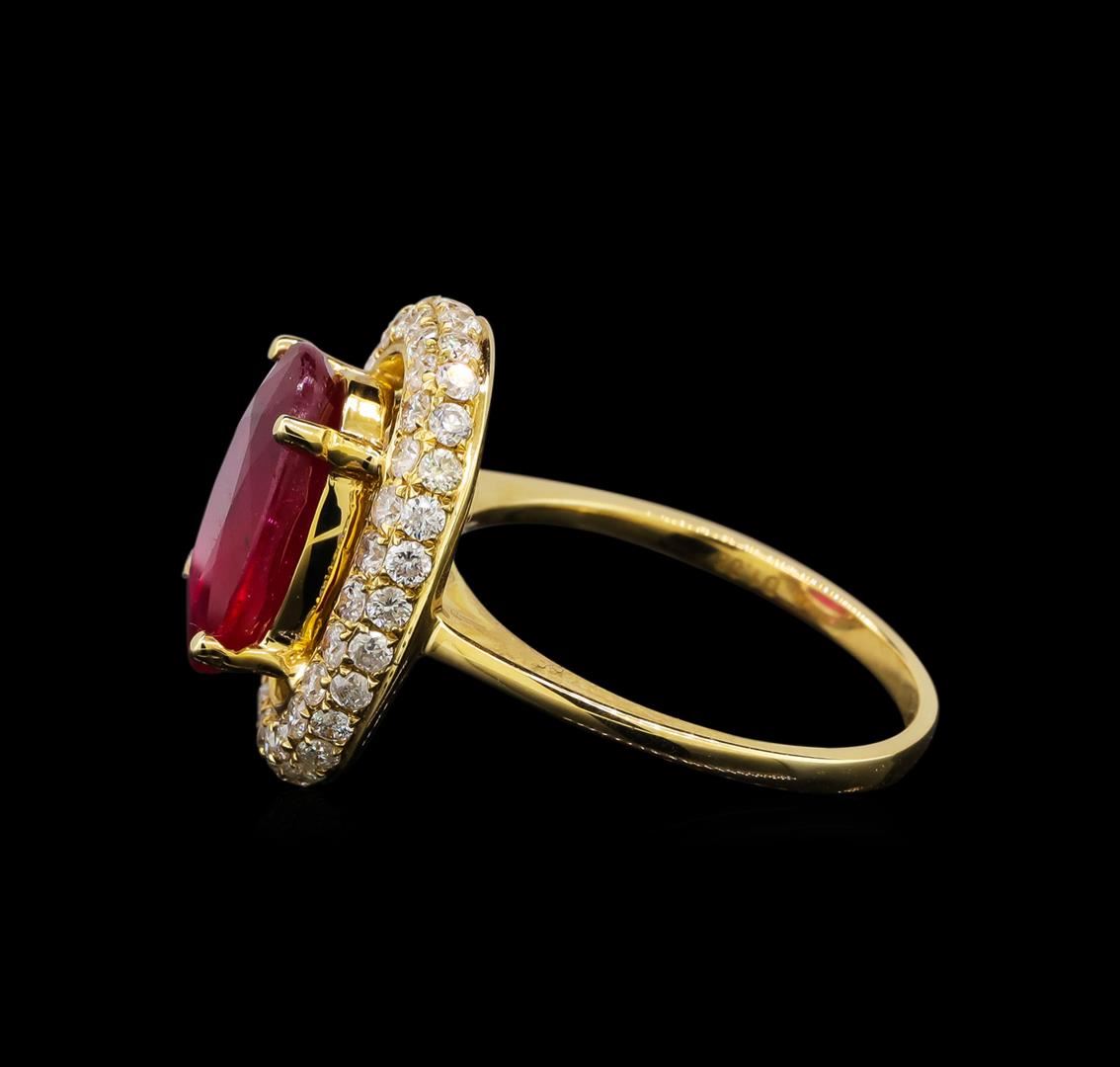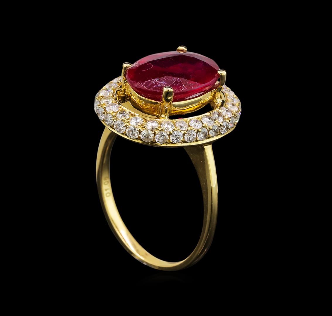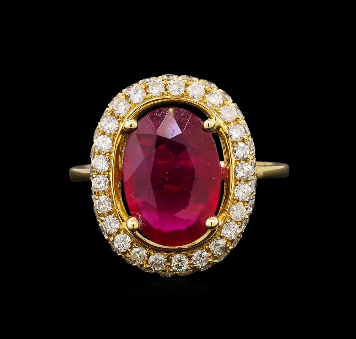 One electronically tested 14KT yellow gold ladies cast ruby and diamond ring with a cathedral shank with a bright polish finish. Trademark is Orianne. Identified with markings of "14K". Condition is new. Containing: One prong set oval modified brilliant cut natural ruby, measuring 12.00 x 8.00 x 4.83mm, approximate weight of 3.89ct., clarity is heavily included, type II, medium dark, very slightly brownish, strongly purplish red color, (GIA stpR 6/3), cut is good. Forty-Eight prong set round brilliant cut diamonds, measuring 1.30 - 1.30 x 0.78mm (depth est.) approximate total weight of 48 Stones = 0.38ct. Clarity: I-1 to I-2. Color: J - K. All diamonds and colored gemstones are graded in the mounting, unless otherwise stated. Colored gemstones are presumed to have been subjected to commonly used enhancement processes. Total Weight of Colored Stones 3.89ct. Total Weight of Diamonds 0.38ct. Total Weight of Ring 5.30 grams. GGL Appraised at $4,300.00.