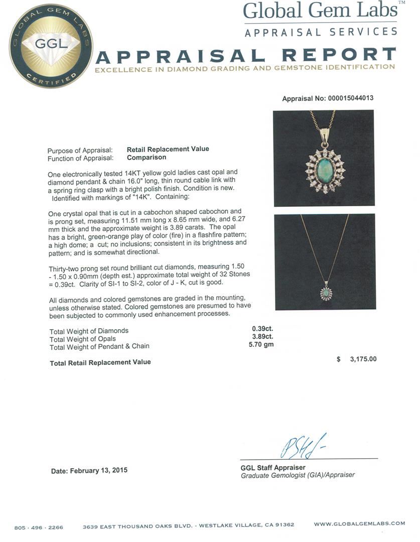One electronically tested 14KT yellow gold ladies cast opal and diamond pendant & chain 16.0" long, thin round cable link with a spring ring clasp with a bright polish finish. Identified with markings of "14K". Condition is new. Containing: One crystal opal that is cut in a cabochon shaped cabochon and is prong set, measuring 11.51 mm long x 8.65 mm wide, and 6.27 mm thick and the approximate weight is 3.89 carats. The opal has a bright, green-orange play of color (fire) in a flashfire pattern; a high dome; a cut; no inclusions; consistent in its brightness and pattern; and is somewhat directional. Thirty-Two prong set round brilliant cut diamonds, measuring 1.50 - 1.50 x 0.90mm (depth est.) approximate total weight of 32 Stones = 0.39ct. Clarity: SI-1 to SI-2. Color: J - K, Cut is Good. All diamonds and colored gemstones are graded in the mounting, unless otherwise stated. Colored gemstones are presumed to have been subjected to commonly used enhancement processes. Total Weight of Diamonds 0.39ct. Total Weight of Opals 3.89ct. Total Weight of Pendant & Chain 5.70 grams. GGL Appraised at $3,175.00.