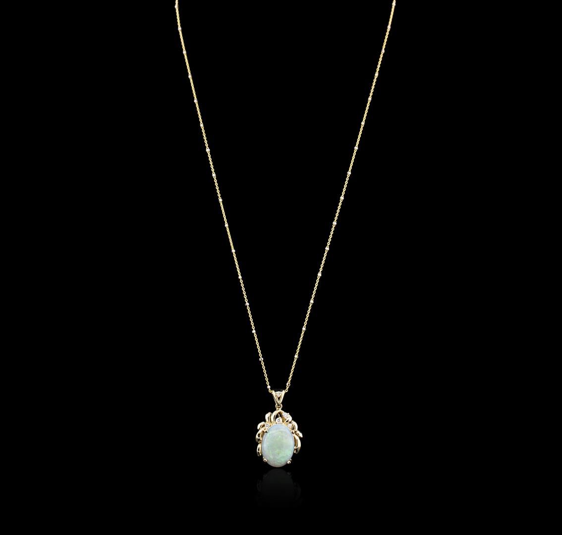 One electronically tested 14KT yellow gold ladies cast opal and diamond pendant & chain 18.0" long, with a spring ring clasp with a bright polish finish. Identified with markings of "14K". Condition is new. Containing: One white opal that is cut in a oval shape and is prong set, measuring 16.40 mm long x 12.00 mm wide, and 4.50 mm thick and the approximate weight is 3.90 carats. The opal has a somewhat bright, green only play of color (fire) in a flashfire pattern; a medium dome; a good cut; no inclusions; consistent in its brightness and pattern; and is somewhat directional. Five prong set round brilliant cut diamonds, measuring 1.80 - 1.80 x 1.08mm (depth est.) approximate total weight of 5 Stones = 0.11ct. Clarity: SI-1 to SI-2. Color: J - K, Cut is Good. Colored gemstones are presumed to have been subjected to commonly used enhancement processes. All diamonds and colored gemstones are graded in the mounting, unless otherwise stated. Total Weight of Diamonds 0.11ct. Total Weight of Opals 3.90ct. Total Weight of Pendant & Chain 7.00 grams. GGL Appraised at $2,595.00.