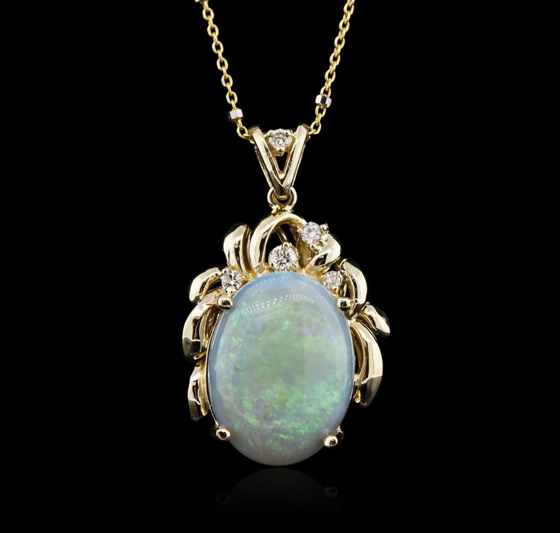 One electronically tested 14KT yellow gold ladies cast opal and diamond pendant & chain 18.0" long, with a spring ring clasp with a bright polish finish. Identified with markings of "14K". Condition is new. Containing: One white opal that is cut in a oval shape and is prong set, measuring 16.40 mm long x 12.00 mm wide, and 4.50 mm thick and the approximate weight is 3.90 carats. The opal has a somewhat bright, green only play of color (fire) in a flashfire pattern; a medium dome; a good cut; no inclusions; consistent in its brightness and pattern; and is somewhat directional. Five prong set round brilliant cut diamonds, measuring 1.80 - 1.80 x 1.08mm (depth est.) approximate total weight of 5 Stones = 0.11ct. Clarity: SI-1 to SI-2. Color: J - K, Cut is Good. Colored gemstones are presumed to have been subjected to commonly used enhancement processes. All diamonds and colored gemstones are graded in the mounting, unless otherwise stated. Total Weight of Diamonds 0.11ct. Total Weight of Opals 3.90ct. Total Weight of Pendant & Chain 7.00 grams. GGL Appraised at $2,595.00.