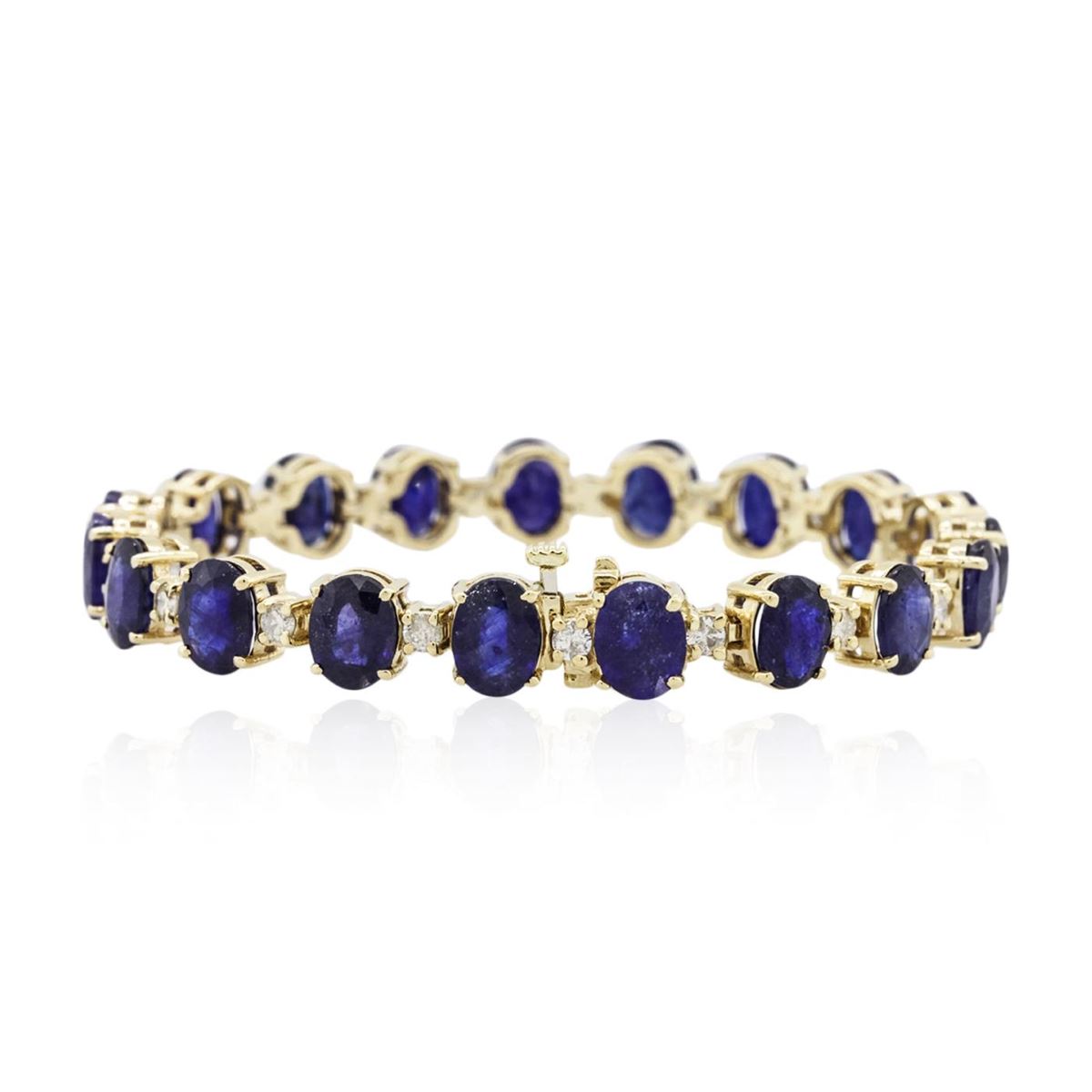 One electronically tested 14KT yellow gold ladies cast & assembled dyed corundum and diamond bracelet. Seven inch length bracelet features a semi-flexible dyed corundum and diamond ribbon, terminating in a concealed clasp with safety bar. Bright polish finish. Identified with markings of "14K". Condition is new, good workmanship. Containing: Nineteen prong set oval mixed cut natural dyed corundums, measuring 8.00 x 6.00 x 4.00mm, approximate total weight of 31.25ct., clarity is heavily included, dark, moderately strong, blue color, (GIA B 7/4), cut is good. Transmitting light somewhat diffusely, transparent to translucent. Naturally occurring internal & external characteristics are present. Measurements & the color grade are an average for the group. Indications of multiple laboratory enhancements, including laboratory high temperature heat treatment, with glass & flux additives and dye. The presence of dye prevents determining whether or not these stones would have sufficient depth of color to be considered blue sapphire. Graded in the setting. Nineteen prong set round brilliant cut diamonds, measuring 2.60 - 2.50 x 1.53mm (depth est.) approximate total weight of 19 Stones = 1.26ct. Graded in the setting. Clarity: I-1 to I-2. Color: H - J. Total Weight of Colored Stones 31.25ct. Total Weight of Diamonds 1.26ct. Total Weight of Bracelet 22.55 grams. AIG Appraised at $5,635.00.