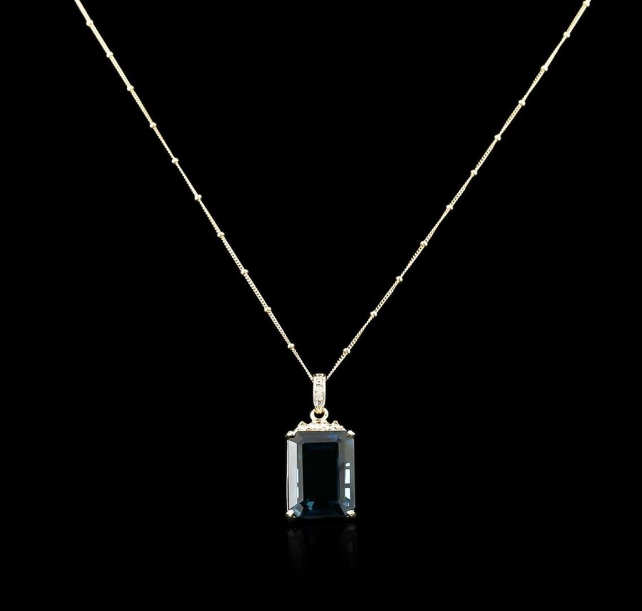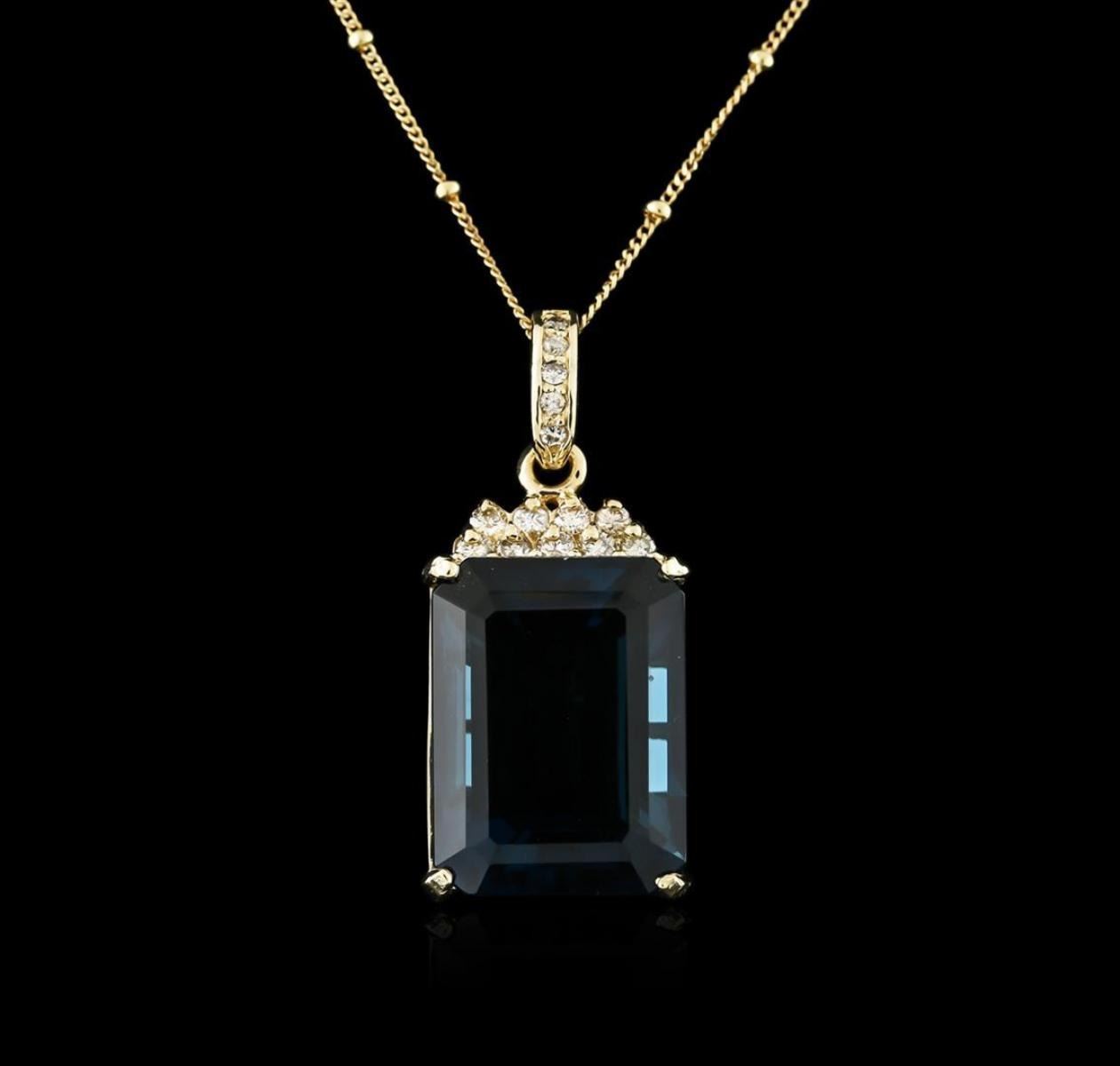 One electronically tested 14KT yellow gold ladies combination cast & assembled topaz and diamond pendant & chain 18.0" long, thin with a lobster claw clasp with a bright polish finish. Identified with markings of "14K". Condition is new. Containing: One prong set emerald standard step cut natural blue topaz, measuring 19.92 x 15.04 x 11.00mm, approximate weight of 31.41ct., clarity is eye clean, type I, medium, very slightly grayish, greenish blue color, (GIA gB 5/3), cut is good. Thirteen prong set round brilliant cut diamonds, measuring 2.00 - 1.50 x 1.05mm (depth est.) approximate total weight of 13 Stones = 0.26ct. Clarity: SI-1 to I-1. Color: K - L, Cut is Good. Diamonds and colored gemstones are graded in the mounting, unless otherwise stated. Colored gemstones are presumed to have been subjected to commonly used enhancement processes. Total Weight of Colored Stones 31.41ct. Total Weight of Diamonds 0.26ct. Total Weight of Pendant & Chain 13.20 grams. GGL Appraised.