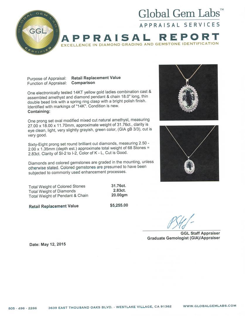 One electronically tested 14KT yellow gold ladies combination cast & assembled amethyst and diamond pendant & chain 18.0" long, thin double bead link with a spring ring clasp with a bright polish finish. Identified with markings of "14K". Condition is new. Containing: One prong set oval modified mixed cut natural amethyst, measuring 27.00 x 18.00 x 11.70mm, approximate weight of 31.76ct., clarity is eye clean, light, very slightly grayish, green color, (GIA gB 3/3), cut is very good. Sixty-Eight prong set round brilliant cut diamonds, measuring 2.50 - 2.00 x 1.35mm (depth est.) approximate total weight of 68 Stones = 2.83ct. Clarity: SI-2 to I-2. Color: K - L, Cut is Good. Diamonds and colored gemstones are graded in the mounting, unless otherwise stated. Colored gemstones are presumed to have been subjected to commonly used enhancement processes. Total Weight of Colored Stones 31.76ct. Total Weight of Diamonds 2.83ct. Total Weight of Pendant & Chain 20.00 grams. GGL Appraised at $5,255.00.