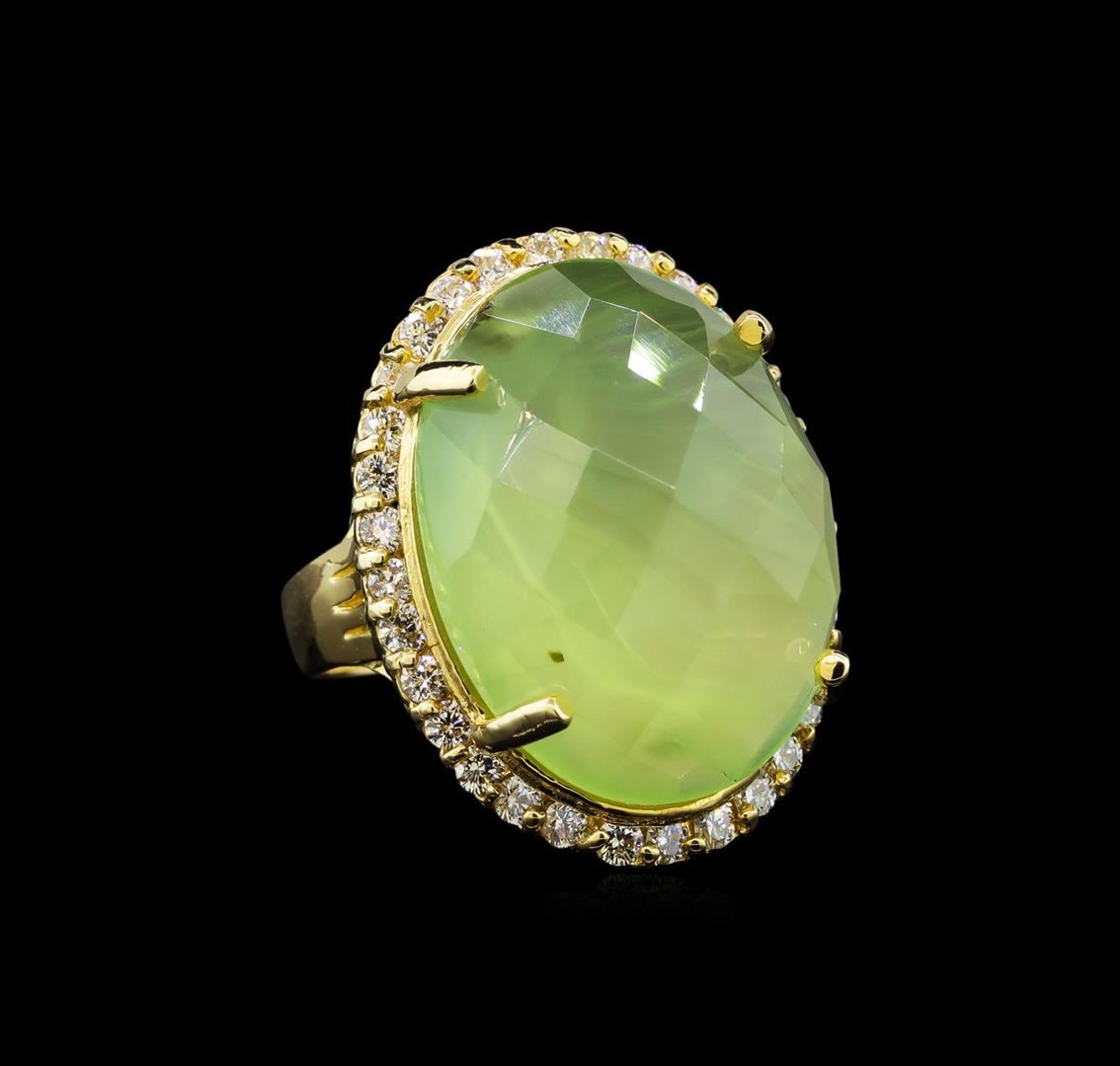 One electronically tested 14KT yellow gold ladies cast tourmaline and diamond ring with a bright polish finish. Identified with markings of "14K". Condition is new. Containing: One prong set oval cabochon cut natural green tourmaline, measuring 24.00. x 18.00. x 9.00.mm, approximate weight of 32.12ct., clarity is heavily included, type I, light, very slightly grayish, green color, (GIA G 3/3), cut is good. Thirty-Four prong set round brilliant cut diamonds, measuring 1.90 - 1.90 x 1.14mm (depth est.) approximate total weight of 34 Stones = 0.85ct. Clarity: SI-2 to I-2. Color: I - J, Cut is Good. Colored gemstones are presumed to have been subjected to commonly used enhancement processes. All diamonds and colored gemstones are graded in the mounting, unless otherwise stated. Total Weight of Colored Stones 32.12ct. Total Weight of Diamonds 0.85ct. Total Weight of Ring 12.10 grams. GGL Appraised at $4,580.00.