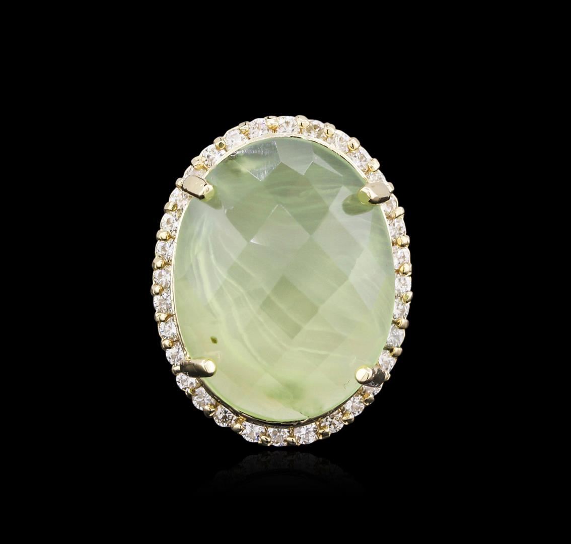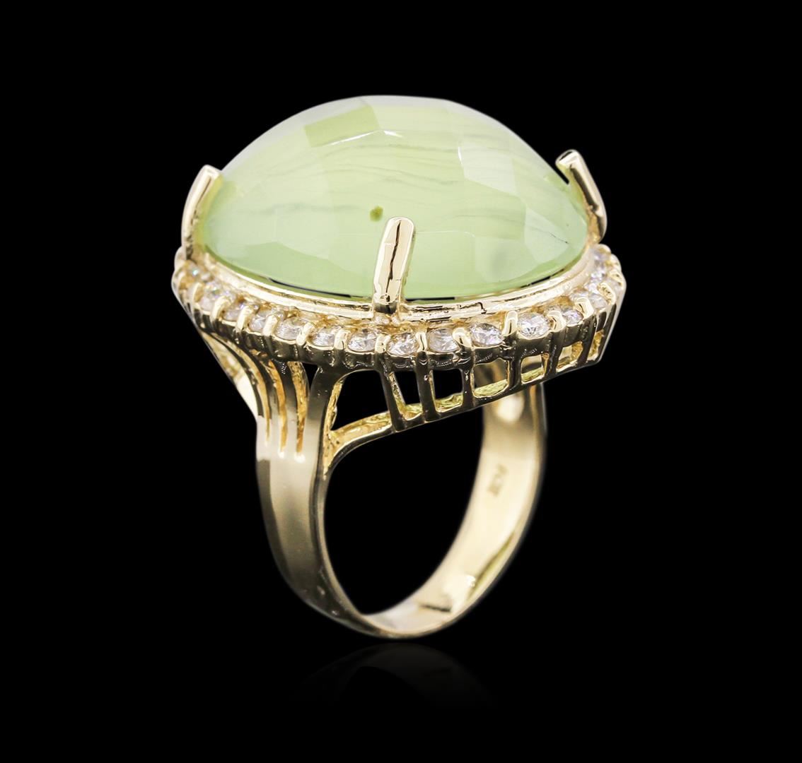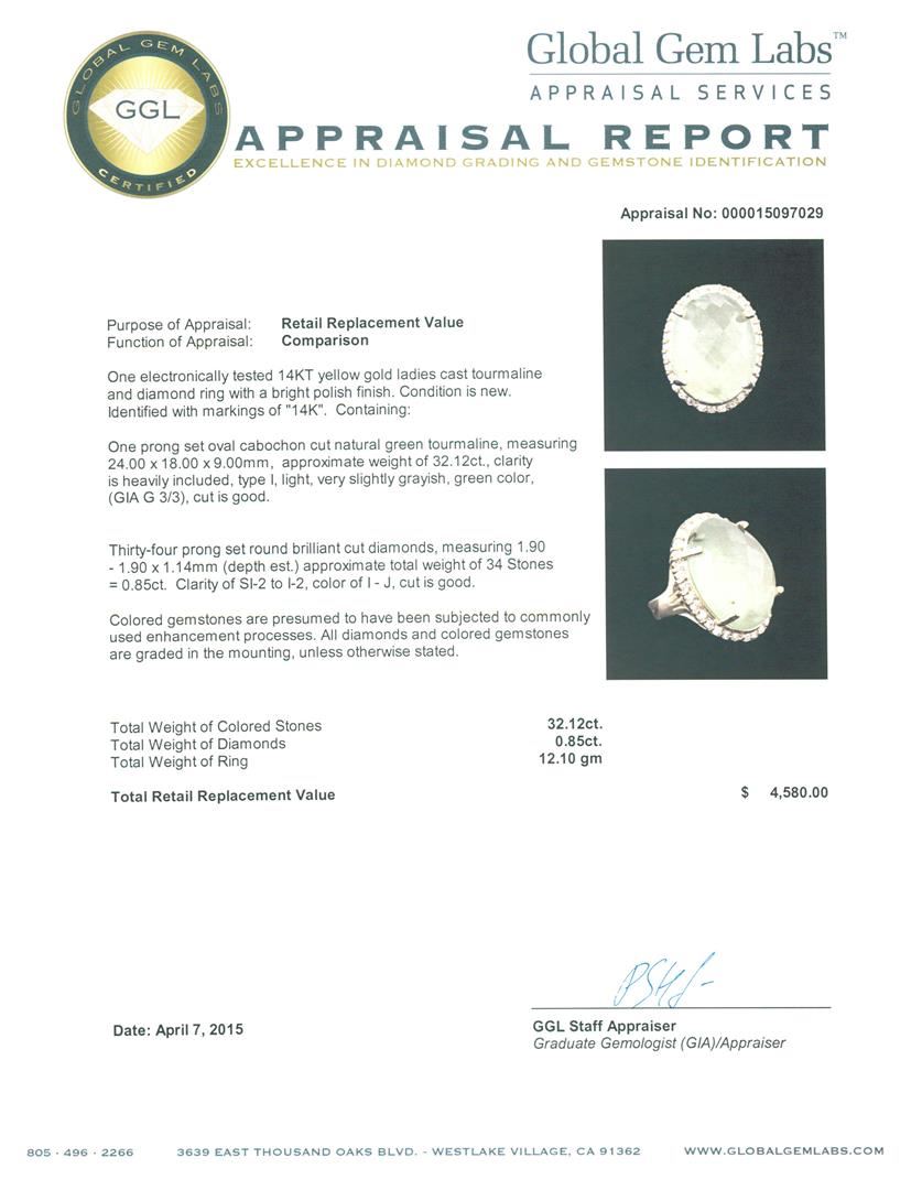 One electronically tested 14KT yellow gold ladies cast tourmaline and diamond ring with a bright polish finish. Identified with markings of "14K". Condition is new. Containing: One prong set oval cabochon cut natural green tourmaline, measuring 24.00. x 18.00. x 9.00.mm, approximate weight of 32.12ct., clarity is heavily included, type I, light, very slightly grayish, green color, (GIA G 3/3), cut is good. Thirty-Four prong set round brilliant cut diamonds, measuring 1.90 - 1.90 x 1.14mm (depth est.) approximate total weight of 34 Stones = 0.85ct. Clarity: SI-2 to I-2. Color: I - J, Cut is Good. Colored gemstones are presumed to have been subjected to commonly used enhancement processes. All diamonds and colored gemstones are graded in the mounting, unless otherwise stated. Total Weight of Colored Stones 32.12ct. Total Weight of Diamonds 0.85ct. Total Weight of Ring 12.10 grams. GGL Appraised at $4,580.00.