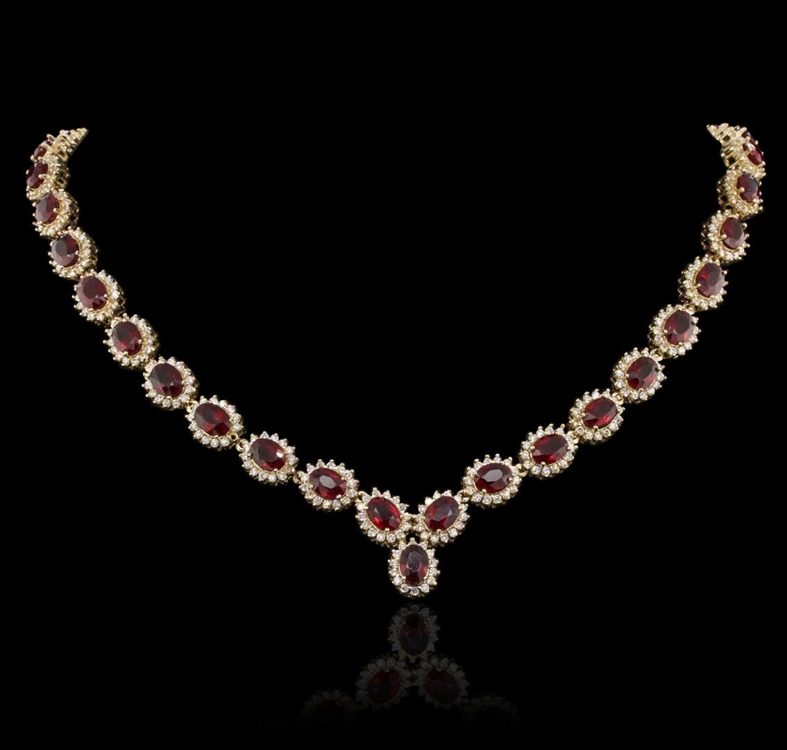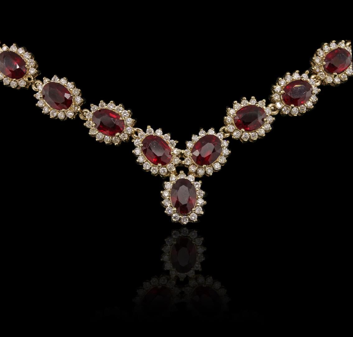One electronically tested 14KT yellow gold ladies combination cast & assembled necklace with a hidden box clasp with a bright polish finish. Condition is new. Measurements: 15.85" in length. Identified with markings of "14K". Containing: Thirty-seven prong set oval modified brilliant cut natural rubies, measuring 6.84 x 4.90 x 3.50mm, approximate. Total Weight of 35.52ct., clarity is heavily included, type II, medium dark, moderately strong, strongly purplish red color, (GIA stpR 6/4), cut is good. Five Hundred Eighteen prong set round brilliant cut diamonds, measuring 1.40 - 1.40 x 0.84mm (depth est.) approximate. Total Weight of 518 Stones = 5.18ct. Clarity: I-1 to I-2. Color: J - K, Cut is Good. Colored gemstones are presumed to have been subjected to commonly used enhancement processes. All diamonds and colored gemstones are graded in the mounting, unless otherwise stated. Total Weight of Colored Stones 35.52ct. Total Weight of Diamonds 5.18ct. Total Weight of Necklace 48.60 grams. GGL Appraised at $38,190.00.