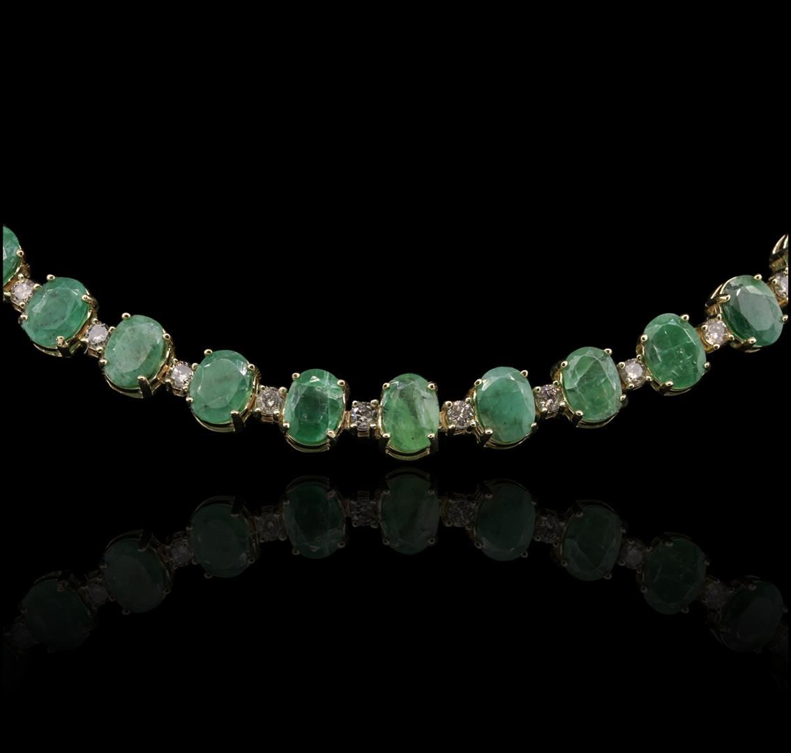 One electronically tested 14KT yellow gold ladies cast & assembled emerald and diamond necklace. Condition is new, good workmanship. Seventeen and three-quarter inch length bracelet features a flexible ribbon of emeralds alternated by diamonds terminating in a concealed clasp with safety bar. Identified with markings of "14K". Containing: Forty-six prong set oval mixed cut natural emeralds, measuring 7.00 x 5.50 x 3.58mm, 6%. bulge factor, approximate. Total Weight of 37.26ct., clarity is severely included, type III, medium, very slightly grayish, very slightly bluish green color, (GIA vslbG 5/3), cut is good. Transmitting light somewhat diffusely, translucent. Naturally occurring internal & external characteristics are present. Indications of oil residue. Measurements & the color grade are an average for the group. Graded in the setting. Forty-Six prong set round brilliant cut diamonds, measuring 2.70 - 2.60 x 1.59mm (depth est.) approximate. Total Weight of 46 Stones = 3.23ct. Color grade is an average for the group. Graded in the setting. Clarity: I-1 to I-3. Total Weight of Colored Stones 37.26ct. Total Weight of Diamonds 3.23ct. Total Weight of Necklace 56.10 grams. AIG Appraised at $21,960.00.