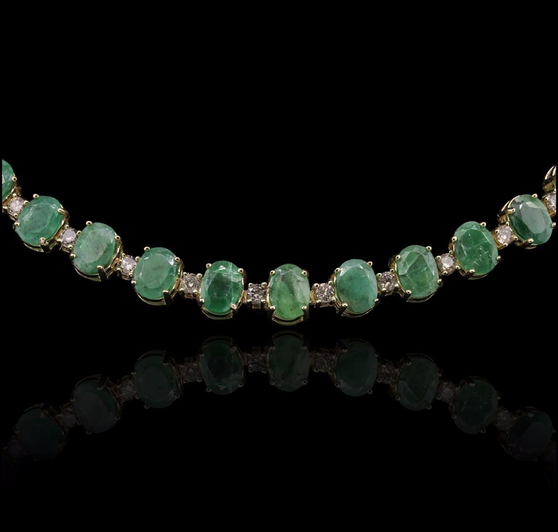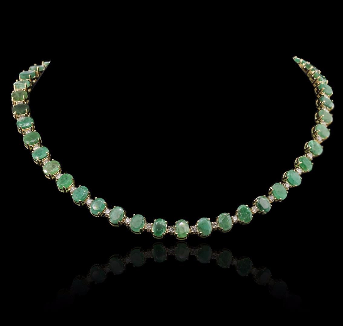 One electronically tested 14KT yellow gold ladies cast & assembled emerald and diamond necklace. Condition is new, good workmanship. Seventeen and three-quarter inch length bracelet features a flexible ribbon of emeralds alternated by diamonds terminating in a concealed clasp with safety bar. Identified with markings of "14K". Containing: Forty-six prong set oval mixed cut natural emeralds, measuring 7.00 x 5.50 x 3.58mm, 6%. bulge factor, approximate. Total Weight of 37.26ct., clarity is severely included, type III, medium, very slightly grayish, very slightly bluish green color, (GIA vslbG 5/3), cut is good. Transmitting light somewhat diffusely, translucent. Naturally occurring internal & external characteristics are present. Indications of oil residue. Measurements & the color grade are an average for the group. Graded in the setting. Forty-Six prong set round brilliant cut diamonds, measuring 2.70 - 2.60 x 1.59mm (depth est.) approximate. Total Weight of 46 Stones = 3.23ct. Color grade is an average for the group. Graded in the setting. Clarity: I-1 to I-3. Total Weight of Colored Stones 37.26ct. Total Weight of Diamonds 3.23ct. Total Weight of Necklace 56.10 grams. AIG Appraised at $21,960.00.