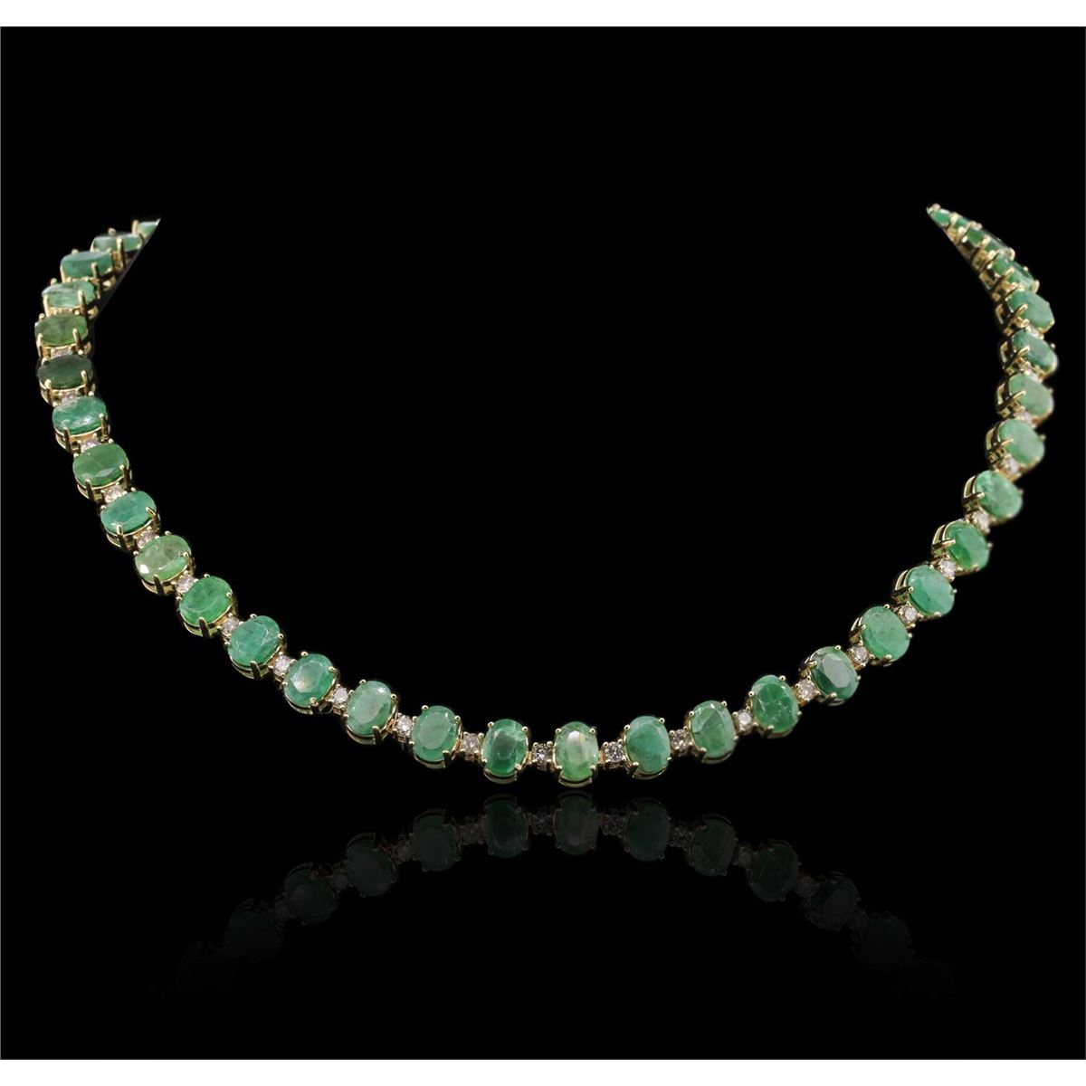 One electronically tested 14KT yellow gold ladies cast & assembled emerald and diamond necklace. Condition is new, good workmanship. Seventeen and three-quarter inch length bracelet features a flexible ribbon of emeralds alternated by diamonds terminating in a concealed clasp with safety bar. Identified with markings of "14K". Containing: Forty-six prong set oval mixed cut natural emeralds, measuring 7.00 x 5.50 x 3.58mm, 6%. bulge factor, approximate. Total Weight of 37.26ct., clarity is severely included, type III, medium, very slightly grayish, very slightly bluish green color, (GIA vslbG 5/3), cut is good. Transmitting light somewhat diffusely, translucent. Naturally occurring internal & external characteristics are present. Indications of oil residue. Measurements & the color grade are an average for the group. Graded in the setting. Forty-Six prong set round brilliant cut diamonds, measuring 2.70 - 2.60 x 1.59mm (depth est.) approximate. Total Weight of 46 Stones = 3.23ct. Color grade is an average for the group. Graded in the setting. Clarity: I-1 to I-3. Total Weight of Colored Stones 37.26ct. Total Weight of Diamonds 3.23ct. Total Weight of Necklace 56.10 grams. AIG Appraised at $21,960.00.