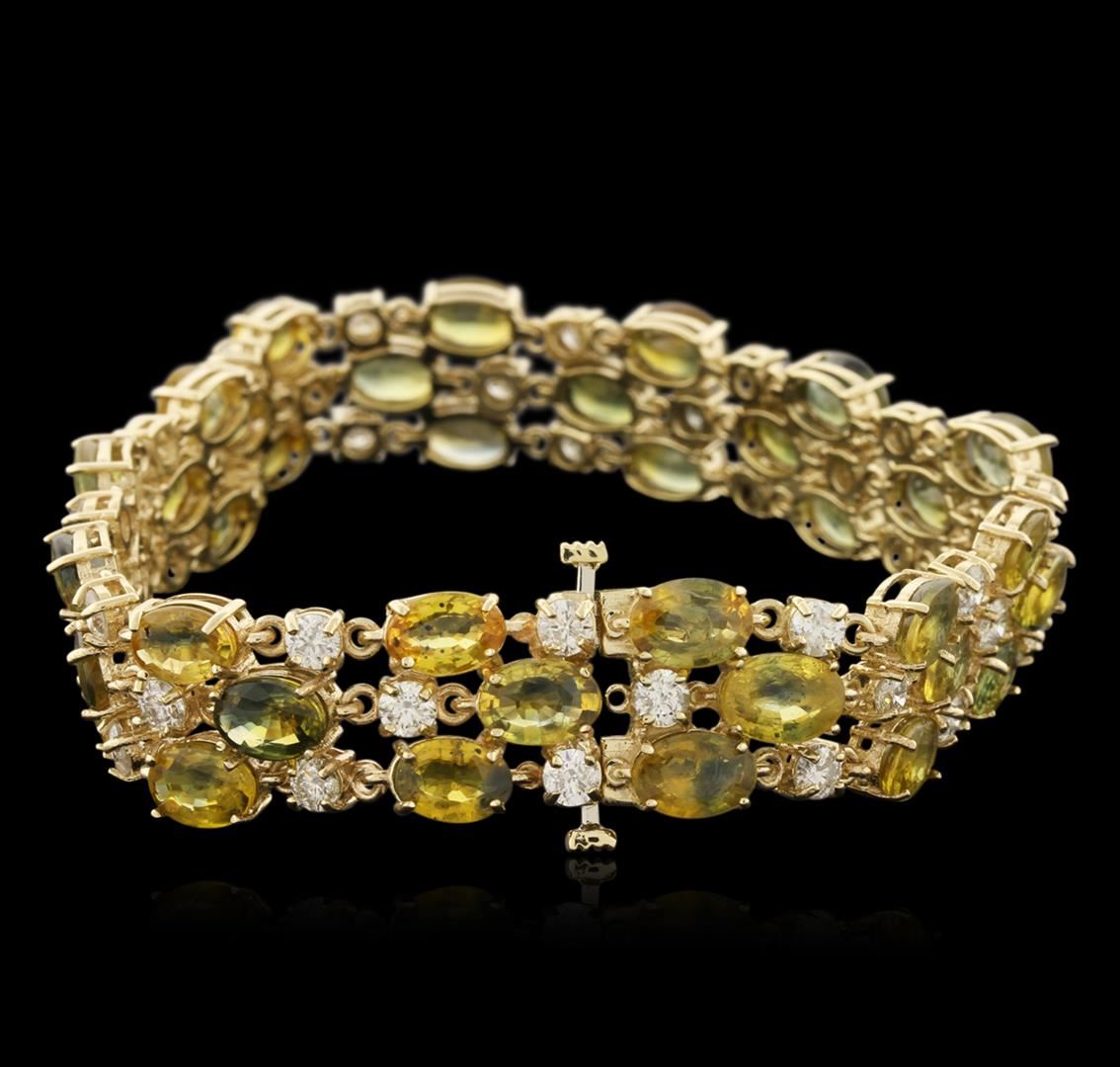 One electronically tested 14KT yellow gold ladies cast sapphire and diamond bracelet with a hidden box clasp with safety closer with a bright polish finish. Measurements: 7" in length. Identified with markings of "14K". Condition is new. Containing: Thirty-nine prong set oval modified brilliant cut natural yellow sapphires, measuring 7.00. x 5.00. x 3.26mm, approximate total weight of 37.44ct., clarity is eye clean, type II, medium light, very slightly brownish, greenish yellow color, (GIA gY 4/3), cut is good. Thirty-Nine prong set round brilliant cut diamonds, measuring 3.40 - 3.40 x 2.04mm (depth est.) approximate total weight of 39 Stones = 5.61ct. Clarity: SI-2 to I-1. Color: J - K, Cut is Good. Colored gemstones are presumed to have been subjected to commonly used enhancement processes. All diamonds and colored gemstones are graded in the mounting, unless otherwise stated. Total Weight of Colored Stones 37.44ct. Total Weight of Diamonds 5.61ct. Total Weight of Bracelet 28.80 grams. GGL Appraised at $13,435.00.