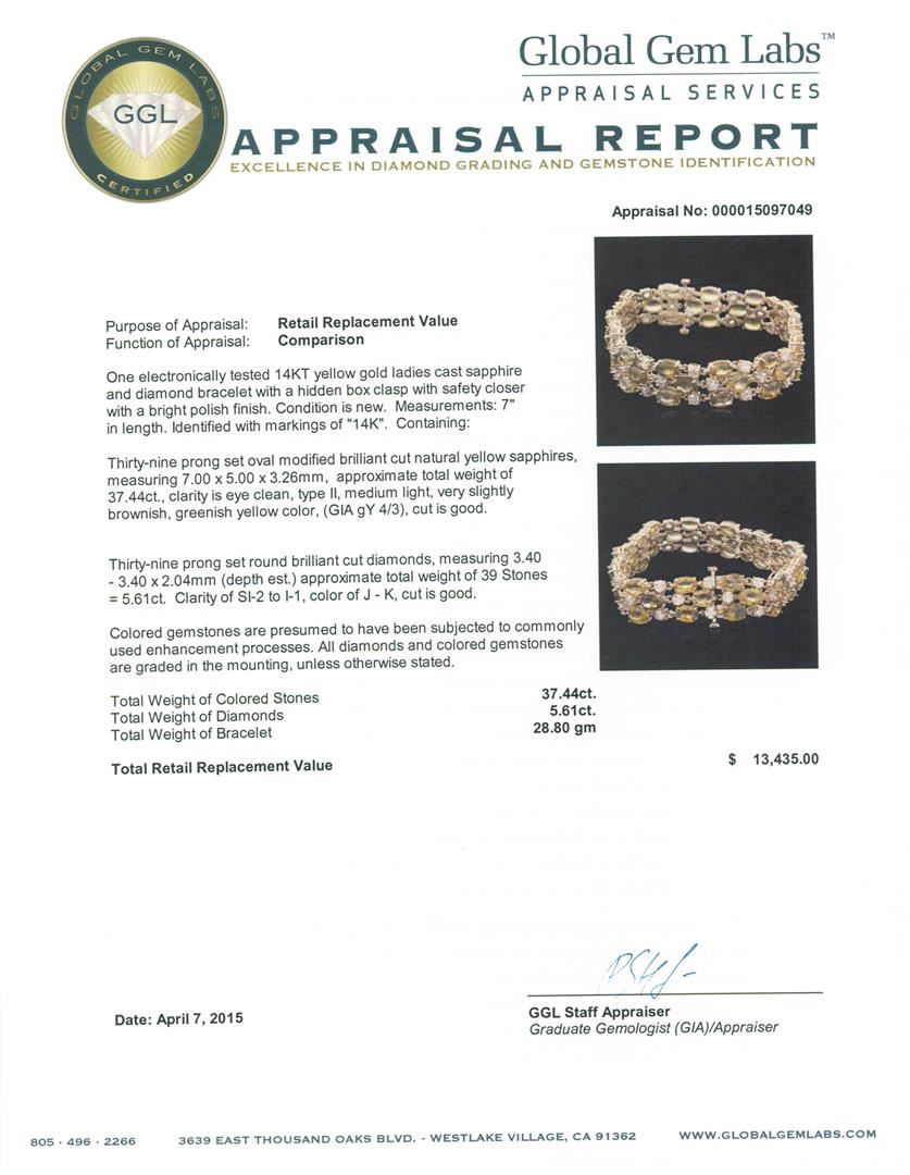 One electronically tested 14KT yellow gold ladies cast sapphire and diamond bracelet with a hidden box clasp with safety closer with a bright polish finish. Measurements: 7" in length. Identified with markings of "14K". Condition is new. Containing: Thirty-nine prong set oval modified brilliant cut natural yellow sapphires, measuring 7.00. x 5.00. x 3.26mm, approximate total weight of 37.44ct., clarity is eye clean, type II, medium light, very slightly brownish, greenish yellow color, (GIA gY 4/3), cut is good. Thirty-Nine prong set round brilliant cut diamonds, measuring 3.40 - 3.40 x 2.04mm (depth est.) approximate total weight of 39 Stones = 5.61ct. Clarity: SI-2 to I-1. Color: J - K, Cut is Good. Colored gemstones are presumed to have been subjected to commonly used enhancement processes. All diamonds and colored gemstones are graded in the mounting, unless otherwise stated. Total Weight of Colored Stones 37.44ct. Total Weight of Diamonds 5.61ct. Total Weight of Bracelet 28.80 grams. GGL Appraised at $13,435.00.