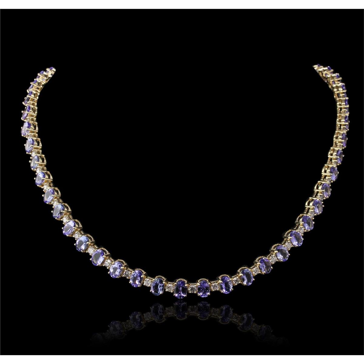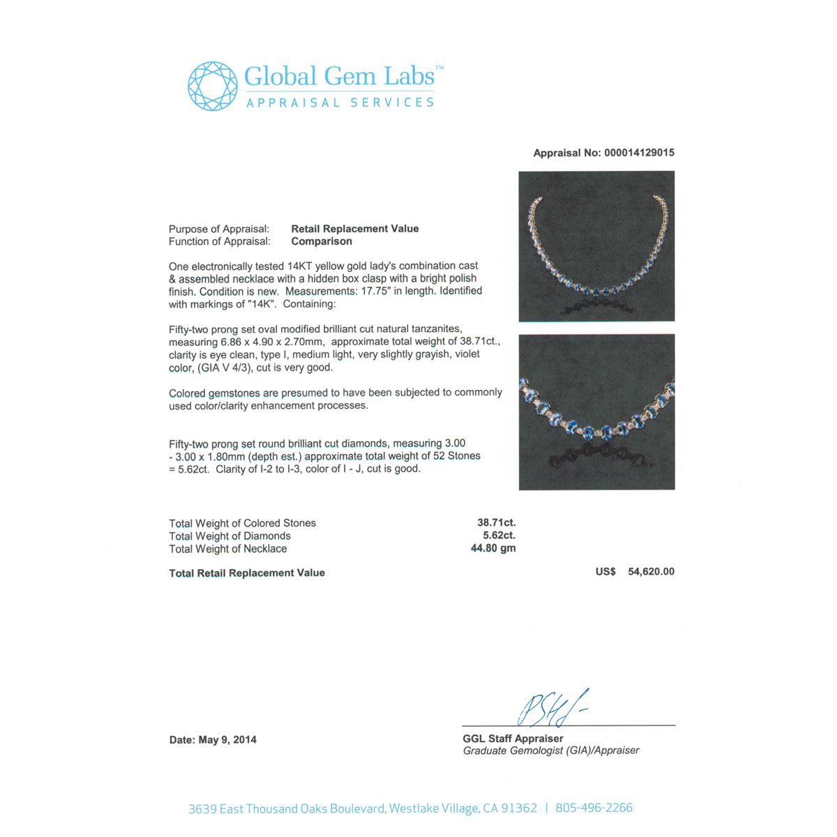 One electronically tested 14KT yellow gold Ladies combination cast & assembled necklace with a hidden box clasp with a bright polish finish. Condition is new. Measurements: 17.75" in length. Identified with markings of "14K". Containing: Fifty-two prong set oval modified brilliant cut natural tanzanites, measuring 6.86 x 4.90 x 2.70mm, approximate. Total Weight of 38.71ct., clarity is eye clean, type I, medium light, very slightly grayish, violet color, (GIA V 4/3), cut is very good. Colored gemstones are presumed to have been subjected to commonly used color/clarity enhancement processes. Fifty-Two prong set round brilliant cut diamonds, measuring 3.00 - 3.00 x 1.80mm (depth est.) approximate. Total Weight of 52 Stones = 5.62ct. Clarity: I-2 to I-3. Color: I - J, Cut is Good. Total Weight of Colored Stones 38.71ct. Total Weight of Diamonds 5.62ct. Total Weight of Necklace 44.80 grams. GGL Appraised at $54,620.00.
