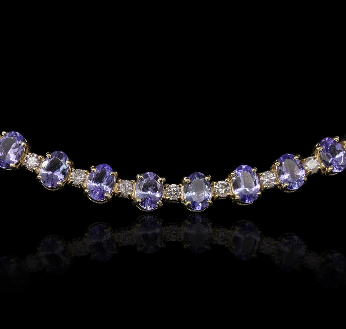 One electronically tested 14KT yellow gold Ladies combination cast & assembled necklace with a hidden box clasp with a bright polish finish. Condition is new. Measurements: 17.75" in length. Identified with markings of "14K". Containing: Fifty-two prong set oval modified brilliant cut natural tanzanites, measuring 6.86 x 4.90 x 2.70mm, approximate. Total Weight of 38.71ct., clarity is eye clean, type I, medium light, very slightly grayish, violet color, (GIA V 4/3), cut is very good. Colored gemstones are presumed to have been subjected to commonly used color/clarity enhancement processes. Fifty-Two prong set round brilliant cut diamonds, measuring 3.00 - 3.00 x 1.80mm (depth est.) approximate. Total Weight of 52 Stones = 5.62ct. Clarity: I-2 to I-3. Color: H - I, Cut is Good. Total Weight of Colored Stones 38.71ct. Total Weight of Diamonds 5.62ct. Total Weight of Necklace 44.90 grams. GGL Appraised at $54,970.00.