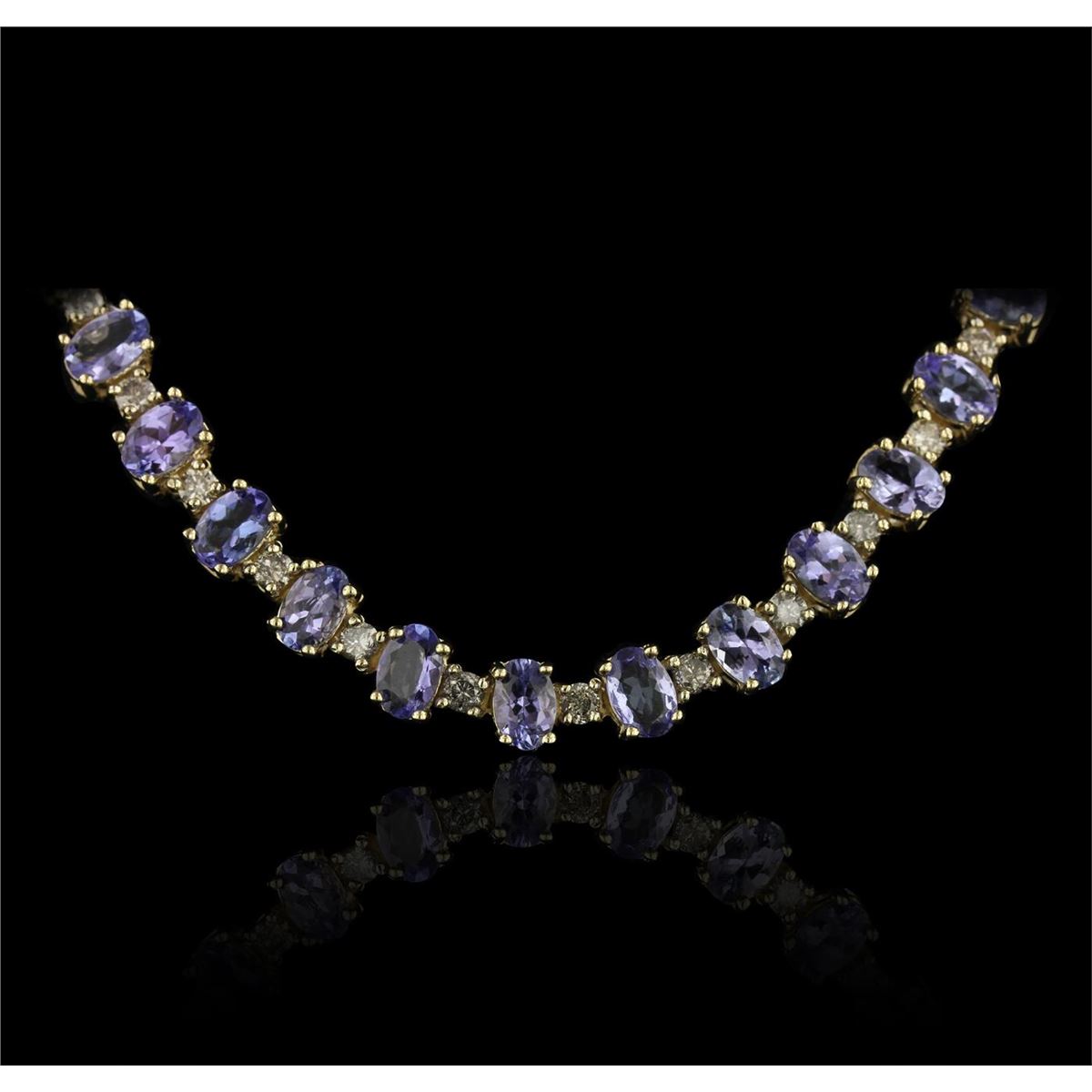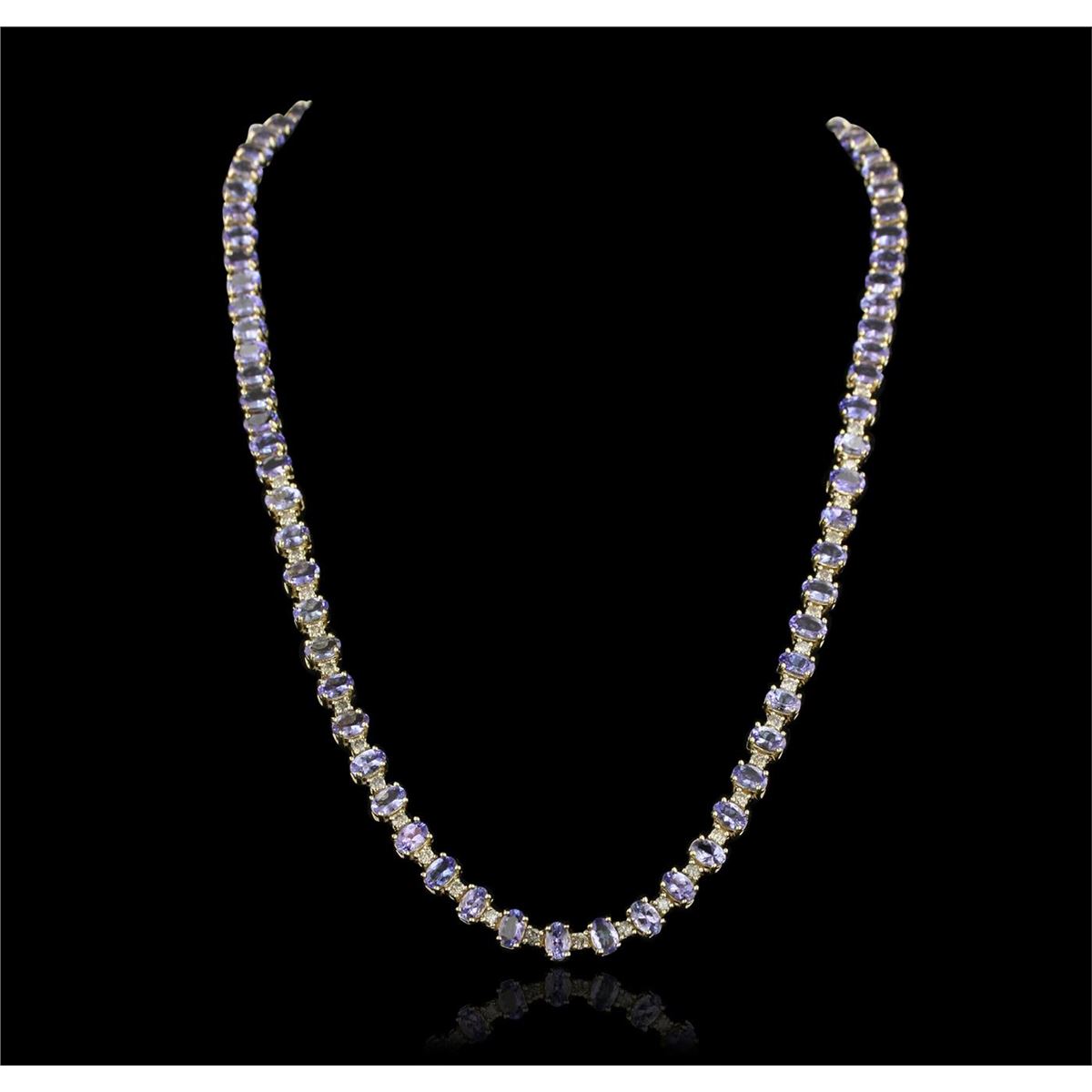One electronically tested 14KT Yellow Gold Ladies combination cast & assembled fashion necklace with a hidden box clasp with a bright polish finish. Condition is new. Measurements: 18" inch in length. Identified with markings of "14K". Containing: Eighty prong set oval modified brilliant cut natural tanzanites, measuring 6.00 x 4.00 x 2.95mm, approximate total weight of 39.20ct., clarity is eye clean, type I, medium light, very slightly grayish, violet color, (GIA V 4/3), cut is good. Colored gemstones are presumed to have been subjected to commonly used and possible undetectable color/clarity enhancement processes. Thirty prong set round brilliant cut diamonds, measuring 2.40 - 2.40 x 1.44mm (depth est.) approximate total weight of 30 Stones = 1.30ct. Clarity of I-2 to I-3, Color of J - K, Cut is Good. Total Weight of Colored Stones 39.20ct. Total Weight of Diamonds 1.30ct. Total Weight of Necklace 36.60gm. GGL Appraised at $23,540.00.