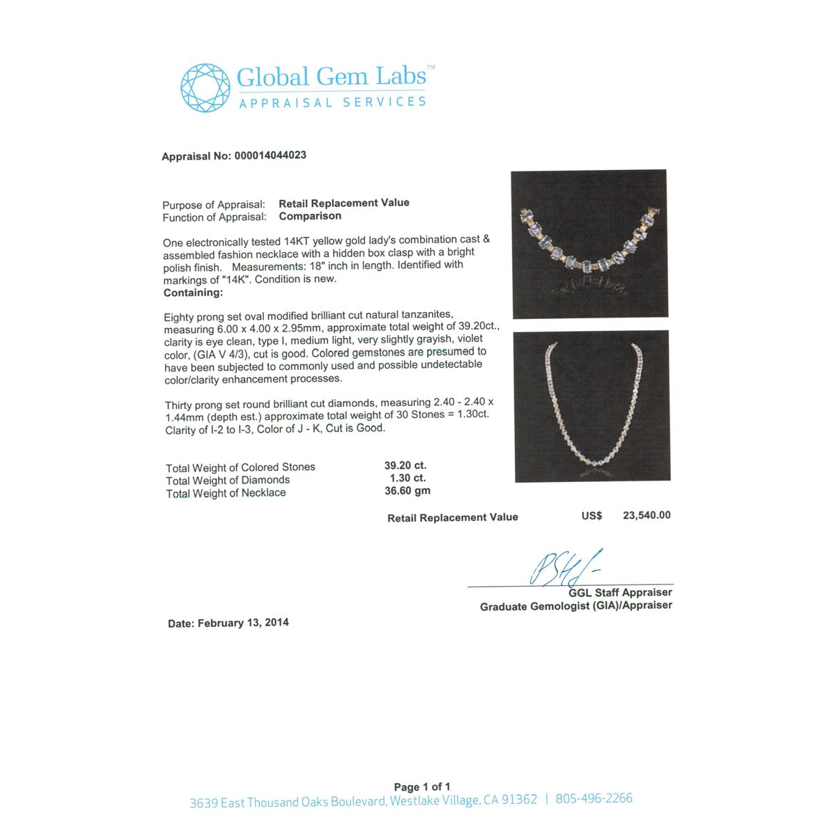 One electronically tested 14KT Yellow Gold Ladies combination cast & assembled fashion necklace with a hidden box clasp with a bright polish finish. Condition is new. Measurements: 18" inch in length. Identified with markings of "14K". Containing: Eighty prong set oval modified brilliant cut natural tanzanites, measuring 6.00 x 4.00 x 2.95mm, approximate total weight of 39.20ct., clarity is eye clean, type I, medium light, very slightly grayish, violet color, (GIA V 4/3), cut is good. Colored gemstones are presumed to have been subjected to commonly used and possible undetectable color/clarity enhancement processes. Thirty prong set round brilliant cut diamonds, measuring 2.40 - 2.40 x 1.44mm (depth est.) approximate total weight of 30 Stones = 1.30ct. Clarity of I-2 to I-3, Color of J - K, Cut is Good. Total Weight of Colored Stones 39.20ct. Total Weight of Diamonds 1.30ct. Total Weight of Necklace 36.60gm. GGL Appraised at $23,540.00.