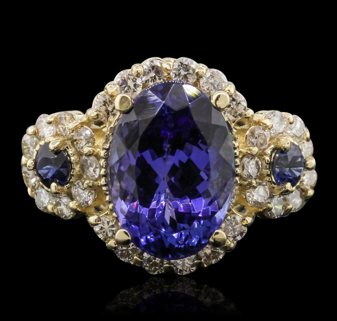 One electronically tested 14KT yellow gold Ladies combination cast & assembled ring with a bright polish finish. Condition is new. Containing: One prong set oval modified brilliant cut natural tanzanite, measuring 11.66 x 8.15 x 6.10mm, approximate weight of 4.01ct., clarity is eye clean, type I, medium, moderately strong, bluish violet color, (GIA bV 5/4), cut is very good. Two prong set round modified brilliant cut natural blue sapphires, measuring 3.10 - 3.10 x 2.02 mm, approximate. Total Weight of 0.32ct., clarity is heavily included, type II, medium dark, moderately strong, blue color, (GIA B 6/4), cut is good. Colored gemstones are presumed to have been subjected to commonly used color/clarity enhancement processes. Thirty prong set round brilliant cut diamonds, measuring 1.70 - 1.70 x 1.02mm (depth est.) approximate. Total Weight of 30 Stones = 0.54ct. Clarity: I-1 to I-3. Color: I - J, Cut is Good. Total Weight of Colored Stones 4.33ct. Total Weight of Diamonds 0.54ct. Total Weight of Ring 6.20 grams. GGL Appraised at $7,280.00.