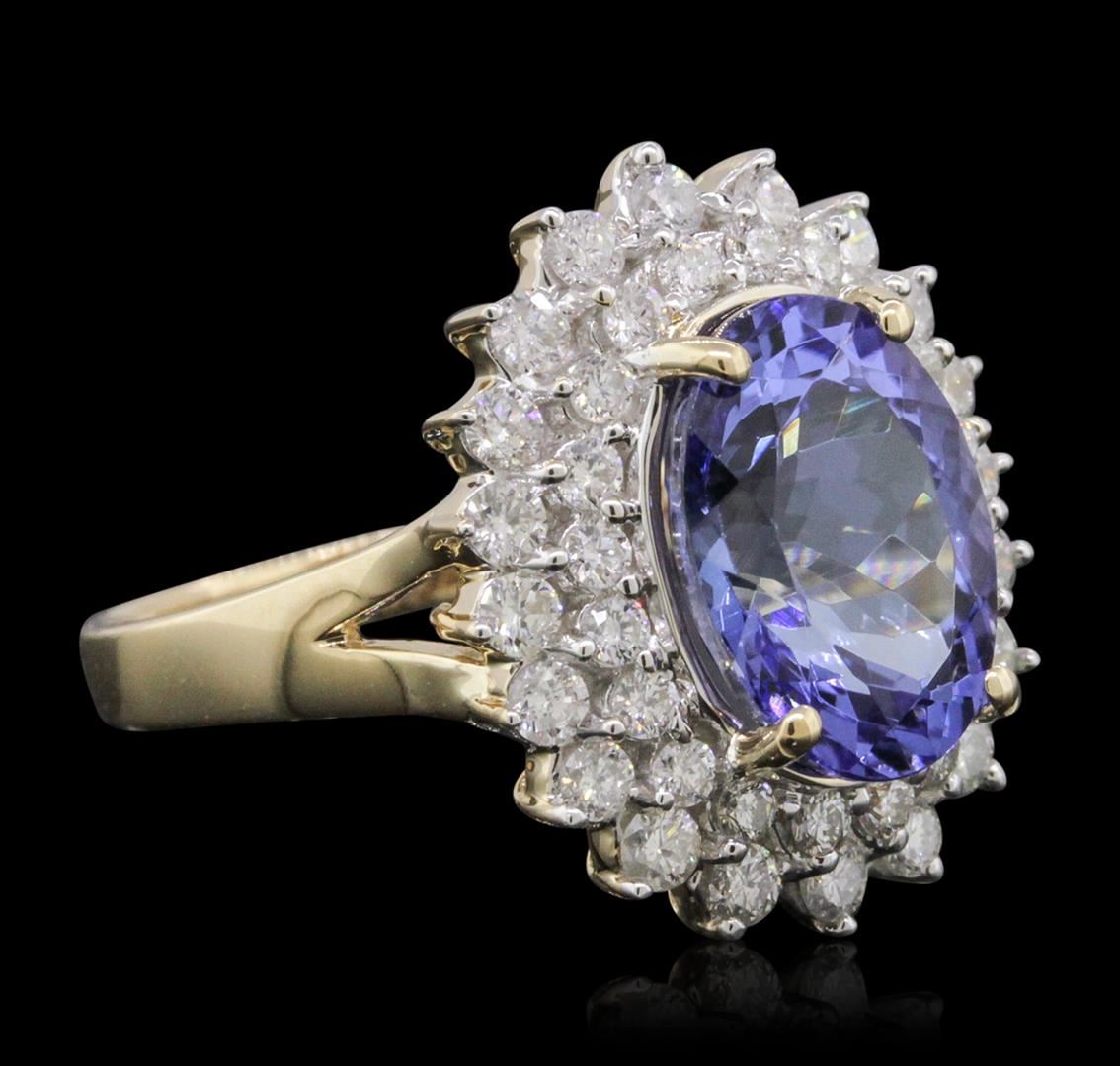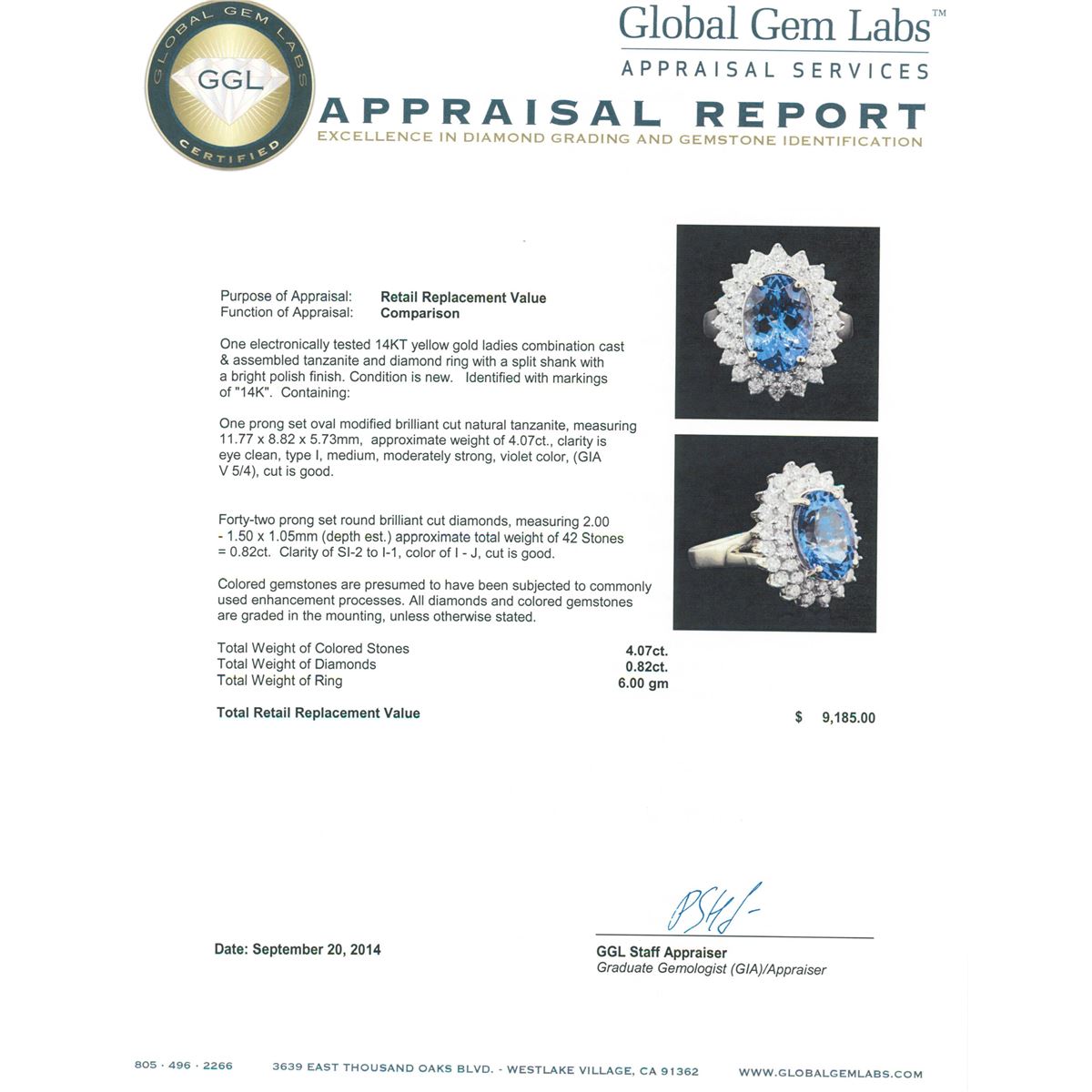 One electronically tested 14KT yellow gold ladies combination cast & assembled tanzanite and diamond ring with a split shank with a bright polish finish. Identified with markings of "14K". Condition is new. Containing: One prong set oval modified brilliant cut natural tanzanite, measuring 11.77 x 8.82 x 5.73mm, approximate weight of 4.07ct., clarity is eye clean, type I, medium, moderately strong, violet color, (GIA V 5/4), cut is good. Forty-Two prong set round brilliant cut diamonds, measuring 2.00 - 1.50 x 1.05mm (depth est.) approximate total weight of 42 Stones = 0.82ct. Clarity: SI-2 to I-1. Color: I - J, Cut is Good. Colored gemstones are presumed to have been subjected to commonly used enhancement processes. All diamonds and colored gemstones are graded in the mounting, unless otherwise stated. Total Weight of Colored Stones 4.07ct. Total Weight of Diamonds 0.82ct. Total Weight of Ring 6.00 grams. GGL Appraised at $9,185.00.