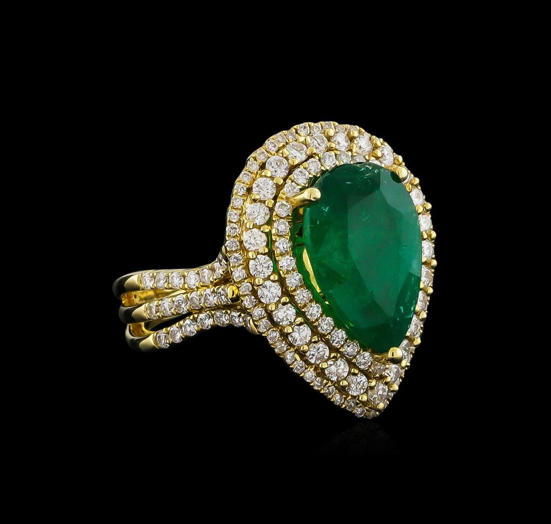 One electronically tested 14KT yellow gold ladies combination cast & assembled emerald and diamond ring with a split shoulder shank with a bright polish finish. Identified with markings of "14K". Condition is new. Containing: One prong set pear modified brilliant cut natural emerald, measuring 15.10 x 9.39 x 5.32mm, approximate weight of 4.10ct., clarity is heavily included, type III, medium, moderately strong, green color, (GIA G 5/4), cut is good. One Hundred Forty-Nine prong set round brilliant cut diamonds, measuring 1.50 - 1.00 x 0.75mm (depth est.) stated total weight of 149 Stones = 1.06ct. Clarity: I-1 to I-2. Color: I - J, Cut is Good. Colored gemstones are presumed to have been subjected to commonly used enhancement processes. All diamonds and colored gemstones are graded in the mounting, unless otherwise stated total weight of Colored Stones 4.10ct. Total Weight of Diamonds 1.06ct. Total Weight of Ring 11.00 grams. GGL Appraised at $13,685.00.