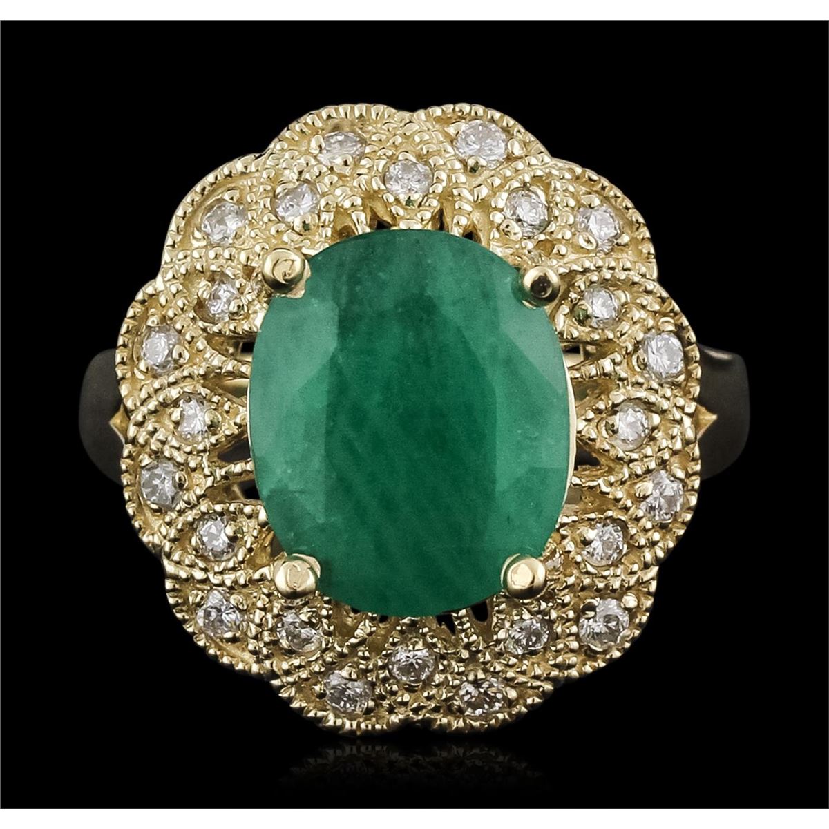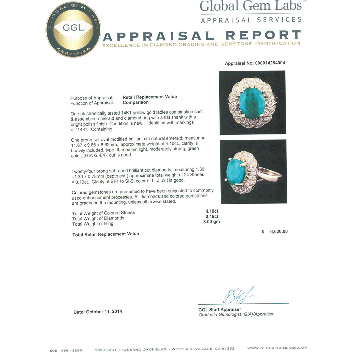 One electronically tested 14KT yellow gold ladies combination cast & assembled emerald and diamond ring with a flat shank with a bright polish finish. Identified with markings of "14K". Condition is new. Containing: One prong set oval modified brilliant cut natural emerald, measuring 11.67 x 9.66 x 6.62mm, approximate weight of 4.10ct., clarity is heavily included, type III, medium light, moderately strong, green color, (GIA G 4/4), cut is good. Twenty-Four prong set round brilliant cut diamonds, measuring 1.30 - 1.30 x 0.78mm (depth est.) approximate total weight of 24 Stones = 0.19ct. Clarity: SI-1 to SI-2. Color: I - J, Cut is Good. Colored gemstones are presumed to have been subjected to commonly used enhancement processes. All diamonds and colored gemstones are graded in the mounting, unless otherwise stated. Total Weight of Colored Stones 4.10ct. Total Weight of Diamonds 0.19ct. Total Weight of Ring 8.00 grams. GGL Appraised at $6,620.00.