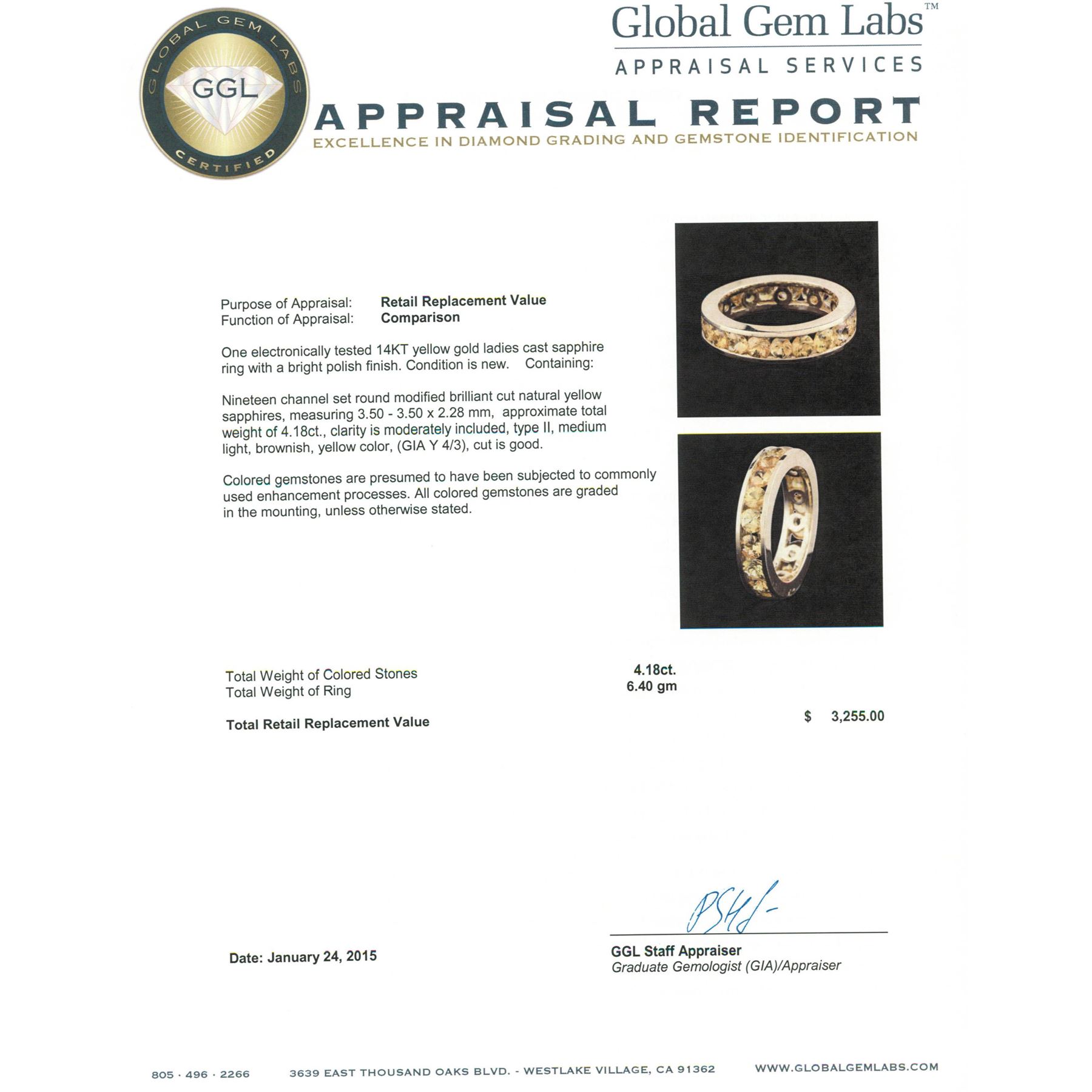 One electronically tested 14KT yellow gold ladies cast sapphire ring with a bright polish finish. Condition is new. Containing: Nineteen channel set round modified brilliant cut natural yellow sapphires, measuring 3.50 - 3.50 x 2.28 mm,approximate total weight of 4.18ct., clarity is moderately included, type II, medium light, brownish, yellow color, (GIA Y 4/3), cut is good. Colored gemstones are presumed to have been subjected to commonly used enhancement processes. All colored gemstones are graded in the mounting, unless otherwise stated. Total Weight of Colored Stones 4.18ct. Total Weight of Ring 6.40 grams. GGL Appraised at $3,255.00.