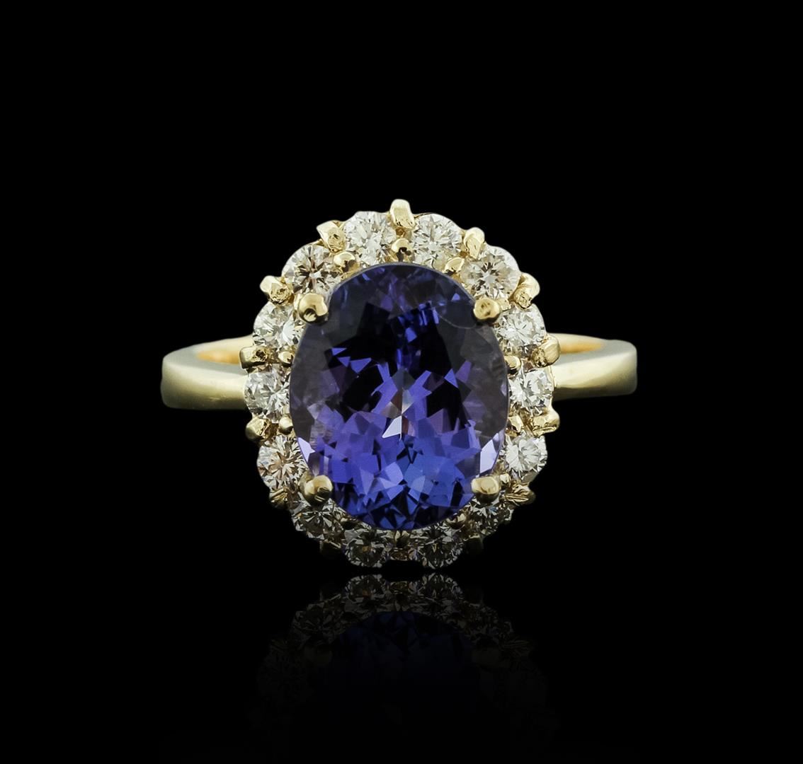 One electronically tested 14KT yellow gold ladies cast tanzanite and diamond ring with a bright polish finish. Identified with markings of "K14". Condition is new. Containing: One prong set oval modified brilliant cut natural tanzanite, measuring 10.80 x 8.50 x 6.47mm, approximate weight of 4.18ct., clarity is eye clean, type I, medium light, slightly grayish, violet color, (GIA V 4/2), cut is good. Fourteen prong set round brilliant cut diamonds, measuring 2.30 - 2.30 x 1.38mm (depth est.) approximate total weight of 14 Stones = 0.62ct. Clarity: SI-1 to SI-2. Color: H - I, Cut is Good. Colored gemstones are presumed to have been subjected to commonly used enhancement processes. All diamonds and colored gemstones are graded in the mounting, unless otherwise stated. Total Weight of Colored Stones 4.18ct. Total Weight of Diamonds 0.62ct. Total Weight of Ring 5.70 grams. GGL Appraised at $4,780.00.