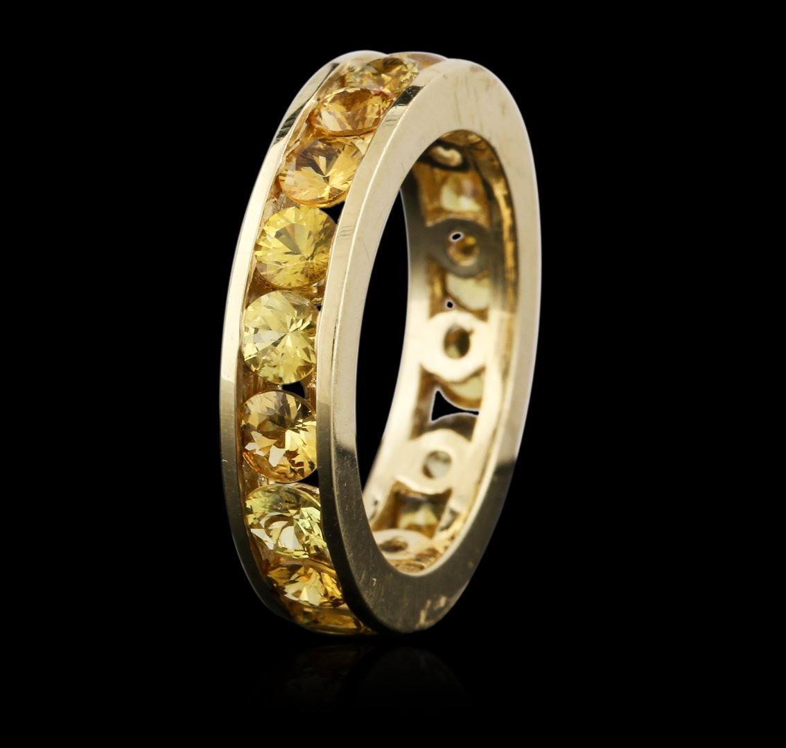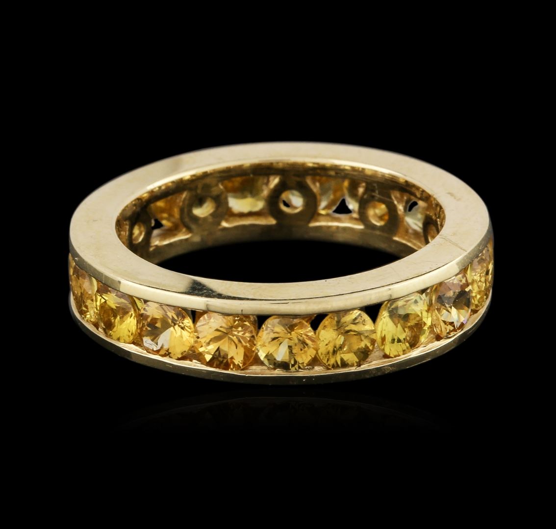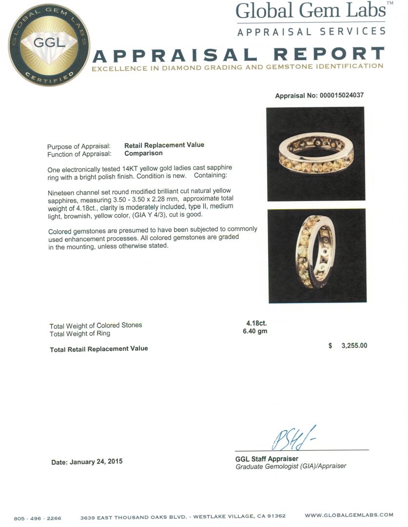 One electronically tested 14KT yellow gold ladies cast sapphire ring with a bright polish finish. Condition is new. Containing: Nineteen channel set round modified brilliant cut natural yellow sapphires, measuring 3.50 - 3.50 x 2.28 mm,approximate total weight of 4.18ct., clarity is moderately included, type II, medium light, brownish, yellow color, (GIA Y 4/3), cut is good. Colored gemstones are presumed to have been subjected to commonly used enhancement processes. All colored gemstones are graded in the mounting, unless otherwise stated. Total Weight of Colored Stones 4.18ct. Total Weight of Ring 6.40 grams. GGL Appraised at $3,255.00.