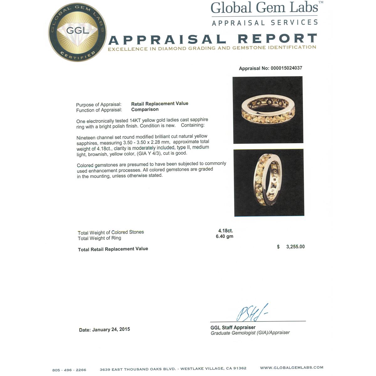 One electronically tested 14KT yellow gold ladies cast sapphire ring with a bright polish finish. Condition is new. Containing: Nineteen channel set round modified brilliant cut natural yellow sapphires, measuring 3.50 - 3.50 x 2.28 mm,approximate total weight of 4.18ct., clarity is moderately included, type II, medium light, brownish, yellow color, (GIA Y 4/3), cut is good. Colored gemstones are presumed to have been subjected to commonly used enhancement processes. All colored gemstones are graded in the mounting, unless otherwise stated. Total Weight of Colored Stones 4.18ct. Total Weight of Ring 6.40 grams. GGL Appraised at $3,255.00.