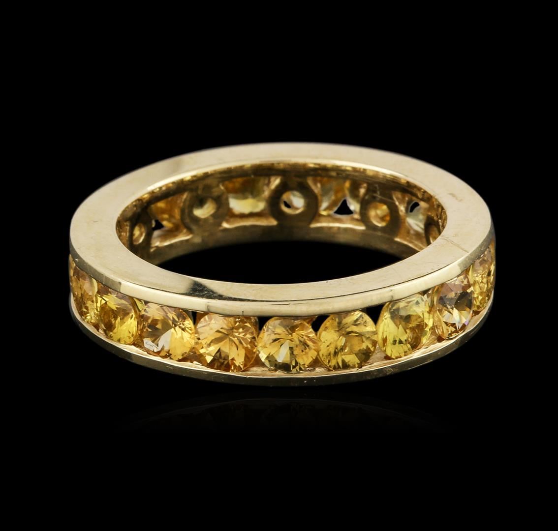 One electronically tested 14KT yellow gold ladies cast sapphire ring with a bright polish finish. Condition is new. Containing: Nineteen channel set round modified brilliant cut natural yellow sapphires, measuring 3.50 - 3.50 x 2.28 mm,approximate total weight of 4.18ct., clarity is moderately included, type II, medium light, brownish, yellow color, (GIA Y 4/3), cut is good. Colored gemstones are presumed to have been subjected to commonly used enhancement processes. All colored gemstones are graded in the mounting, unless otherwise stated. Total Weight of Colored Stones 4.18ct. Total Weight of Ring 6.40 grams. GGL Appraised at $3,255.00.