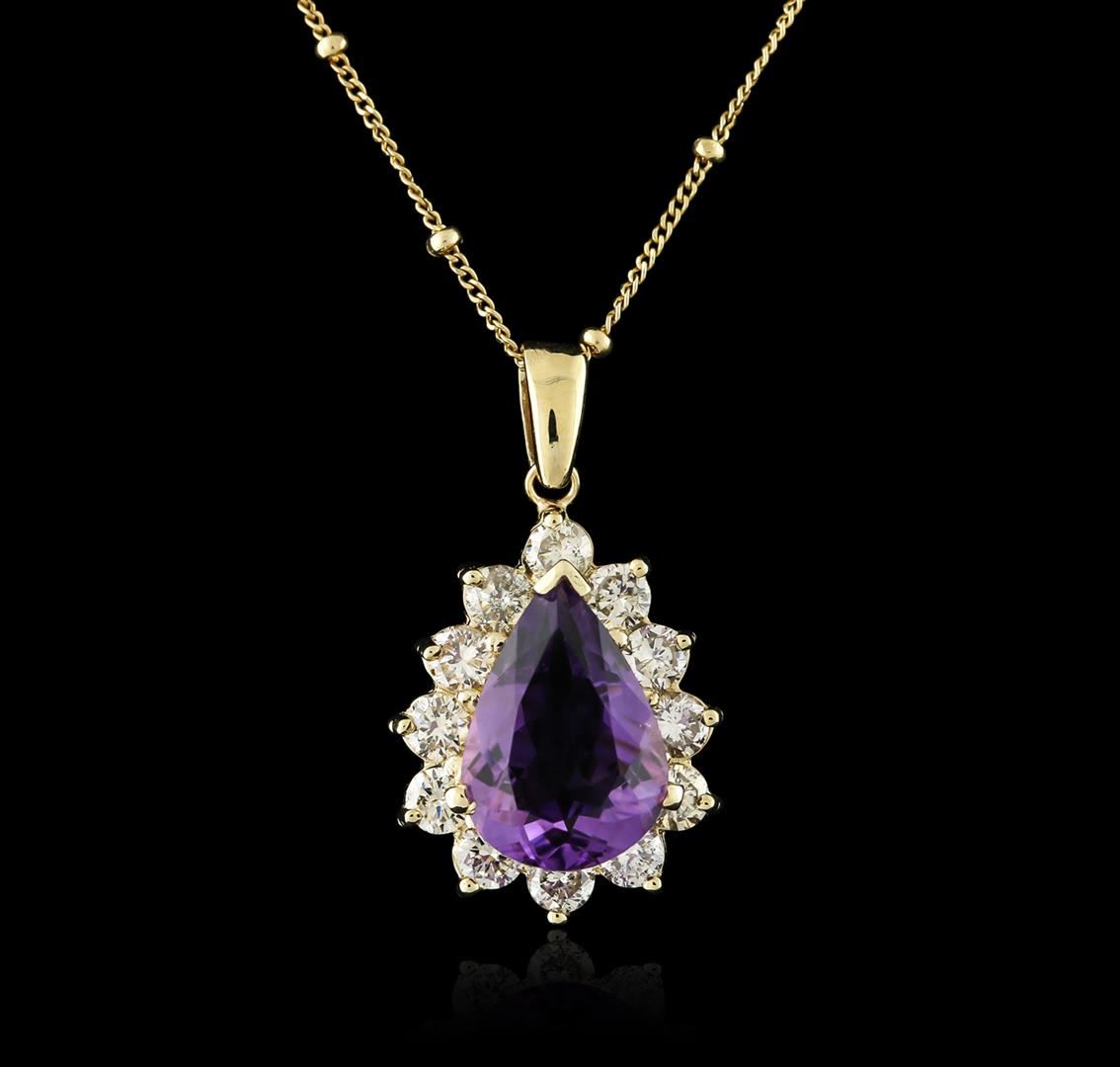 One electronically tested 14KT yellow gold ladies combination cast & assembled tanzanite and diamond pendant & chain 18.0" long, thin beaded curb link with a spring ring clasp with a bright polish finish. Identified with markings of "14K". Condition is new. Containing: One prong set pear modified brilliant cut natural amethyst, measuring 13.25 x 9.87 x 6.30mm, approximate weight of 4.38ct., clarity is eye clean, type II, medium light, very slightly grayish, purple color, (GIA P 4/3), cut is good. Twelve prong set round brilliant cut diamonds, measuring 3.00 - 3.00 x 1.80mm (depth est.) approximate total weight of 12 Stones = 1.19ct. Clarity: SI-2 to I-2. Color: K - L, Cut is Good. Diamonds and colored gemstones are graded in the mounting, unless otherwise stated. Colored gemstones are presumed to have been subjected to commonly used enhancement processes. Total Weight of Colored Stones 4.38ct. Total Weight of Diamonds 1.19ct. Total Weight of Pendant & Chain 8.10 grams. GGL Appraised at $2,510.00.