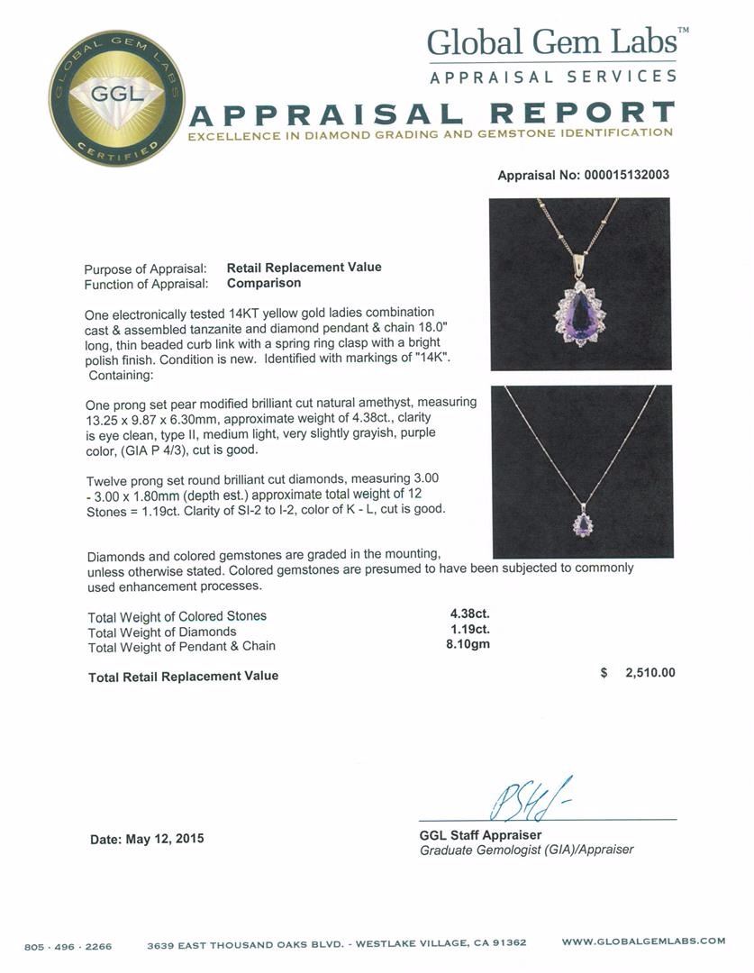 One electronically tested 14KT yellow gold ladies combination cast & assembled tanzanite and diamond pendant & chain 18.0" long, thin beaded curb link with a spring ring clasp with a bright polish finish. Identified with markings of "14K". Condition is new. Containing: One prong set pear modified brilliant cut natural amethyst, measuring 13.25 x 9.87 x 6.30mm, approximate weight of 4.38ct., clarity is eye clean, type II, medium light, very slightly grayish, purple color, (GIA P 4/3), cut is good. Twelve prong set round brilliant cut diamonds, measuring 3.00 - 3.00 x 1.80mm (depth est.) approximate total weight of 12 Stones = 1.19ct. Clarity: SI-2 to I-2. Color: K - L, Cut is Good. Diamonds and colored gemstones are graded in the mounting, unless otherwise stated. Colored gemstones are presumed to have been subjected to commonly used enhancement processes. Total Weight of Colored Stones 4.38ct. Total Weight of Diamonds 1.19ct. Total Weight of Pendant & Chain 8.10 grams. GGL Appraised at $2,510.00.
