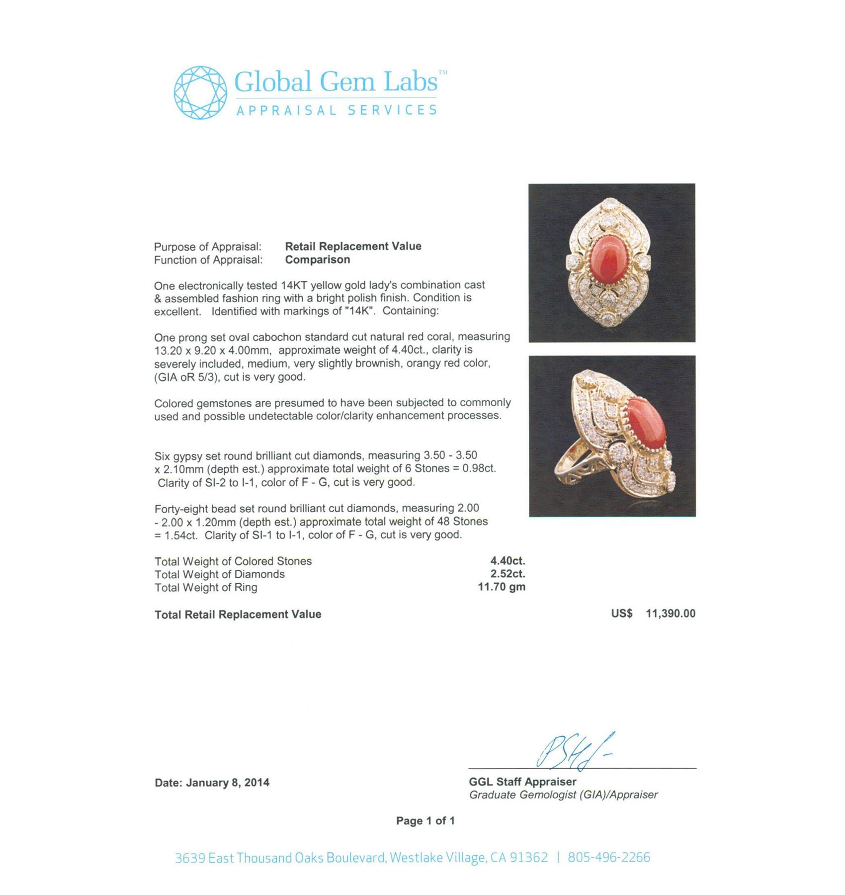 One electronically tested 14KT yellow gold Ladies combination cast & assembled fashion ring with a bright polish finish. Identified with markings of "14K". Condition is excellent. Containing: One prong set oval cabochon standard cut natural red coral, measuring 13.20 x 9.20 x 4.00mm, approximate weight of 4.40ct., clarity is severely included, medium, very slightly brownish, orangy red color, (GIA oR 5/3), cut is very good. Colored gemstones are presumed to have been subjected to commonly used and possible undetectable color/clarity enhancement processes. Six gypsy set round brilliant cut diamonds, measuring 3.50 - 3.50 x 2.10mm (depth est.) approximate total weight of 6 Stones = 0.98ct. Clarity of SI-2 to I-1, Color of F - G, Cut is Very Good. Forty-Eight bead set round brilliant cut diamonds, measuring 2.00 - 2.00 x 1.20mm (depth est.) approximate total weight of 48 Stones = 1.54ct. Clarity of SI-1 to I-1, Color of F - G, Cut is Very Good. Total Weight of Colored Stones 4.40ct. Total Weight of Diamonds 2.52ct. Total Weight of Ring 11.70gm. GGL Appraised at $11,390.00.
