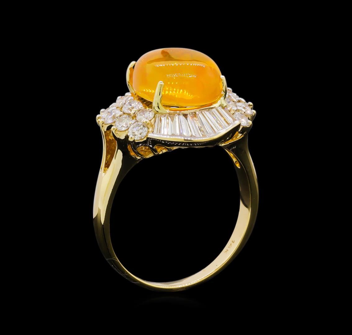 One electronically tested 14KT yellow gold ladies cast opal and diamond ring. The featured opal is set within a stylized diamond bezel supported by three-way split shoulders, completed by a two millimeter wide band. Bright polish finish with rhodium accents. Identified with markings of "14K". Condition is new, good workmanship. Containing: One jelly opal that is cut in a oval shaped cabochon and is prong set, measuring 12.00 mm long x 10.00 mm wide, and 5.48 mm thick and the approximate weight is 4.43 carats. The opal has a somewhat bright, orange-green play of color (fire) in a flashfire pattern; a high dome; a good cut; no inclusions; slight variation in base in its brightness and pattern; and is somewhat directional. Graded in the setting. Eighteen prong set round brilliant cut diamonds, measuring 2.30 - 2.20 x 1.35mm (depth est.) approximate total weight of 18 Stones = 0.85ct. Graded in the setting. Clarity: SI-2 to I-1. Color: F - H Twenty-Four channel set baguette cut diamonds, measuring from 2.40 x 1.10 x 0.77mm (depth est.) to 3.80 x 1.20 x 0.84mm (depth est.) approximate total weight of 24 Stones = 0.63ct. Graded in the setting. Clarity: VVS-2 to VS-2. Color: F - H. Total Weight of Diamonds 1.48ct. Total Weight of Opals 4.43ct. Total Weight of Ring 5.34 grams. AIG Appraised at $6,250.00.