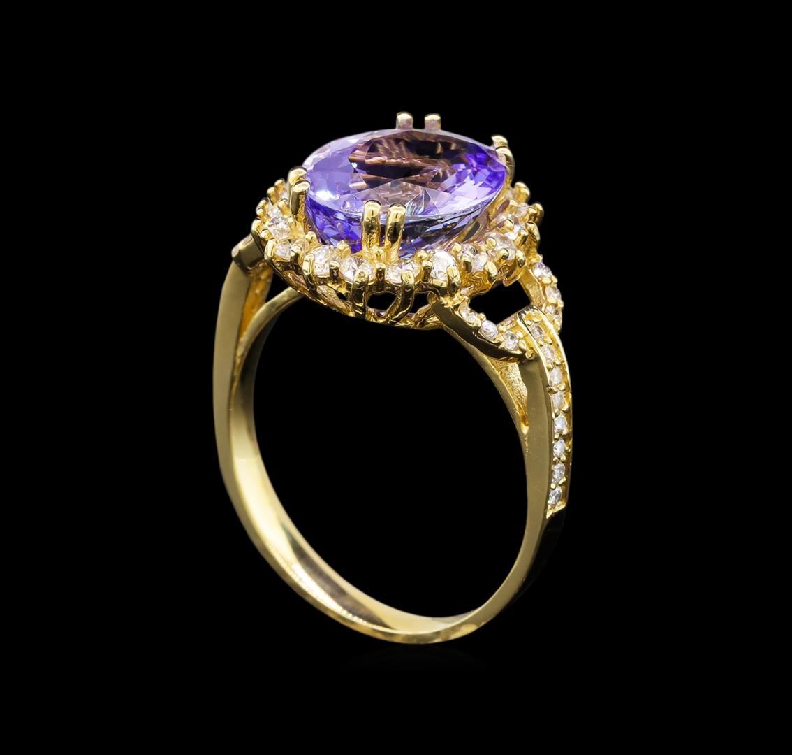 One electronically tested 14KT yellow gold ladies cast tanzanite and diamond ring with a bright polish finish. Identified with markings of "K14". Condition is new. Containing: One prong set oval modified brilliant cut natural tanzanite, measuring 11.50 x 9.20 x 5.98mm, approximate weight of 4.45ct., clarity is eye clean, type I, light, very slightly grayish, violet color, (GIA V 3/3), cut is good. Forty-Eight prong set round brilliant cut diamonds, measuring 2.00 - 1.30 x 0.99mm (depth est.) approximate total weight of 48 Stones = 0.79ct. Clarity: SI-1 to SI-2. Color: K - L, Cut is Good. Colored gemstones are presumed to have been subjected to commonly used enhancement processes. All diamonds and colored gemstones are graded in the mounting, unless otherwise stated. Total Weight of Colored Stones 4.45ct. Total Weight of Diamonds 0.79ct. Total Weight of Ring 4.40 grams. GGL Appraised at $4,860.00.