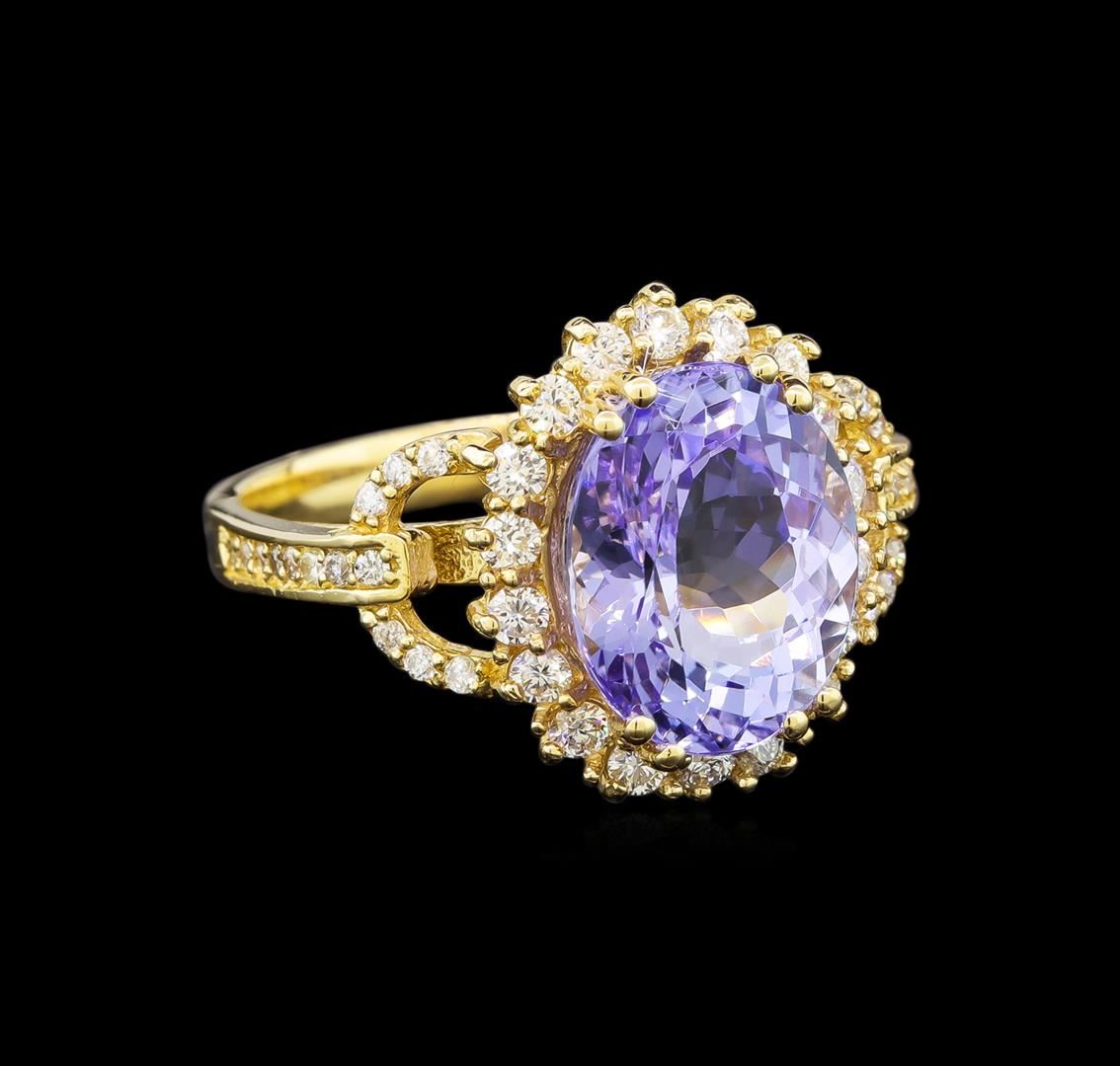 One electronically tested 14KT yellow gold ladies cast tanzanite and diamond ring with a bright polish finish. Identified with markings of "K14". Condition is new. Containing: One prong set oval modified brilliant cut natural tanzanite, measuring 11.50 x 9.20 x 5.98mm, approximate weight of 4.45ct., clarity is eye clean, type I, light, very slightly grayish, violet color, (GIA V 3/3), cut is good. Forty-Eight prong set round brilliant cut diamonds, measuring 2.00 - 1.30 x 0.99mm (depth est.) approximate total weight of 48 Stones = 0.79ct. Clarity: SI-1 to SI-2. Color: K - L, Cut is Good. Colored gemstones are presumed to have been subjected to commonly used enhancement processes. All diamonds and colored gemstones are graded in the mounting, unless otherwise stated. Total Weight of Colored Stones 4.45ct. Total Weight of Diamonds 0.79ct. Total Weight of Ring 4.40 grams. GGL Appraised.