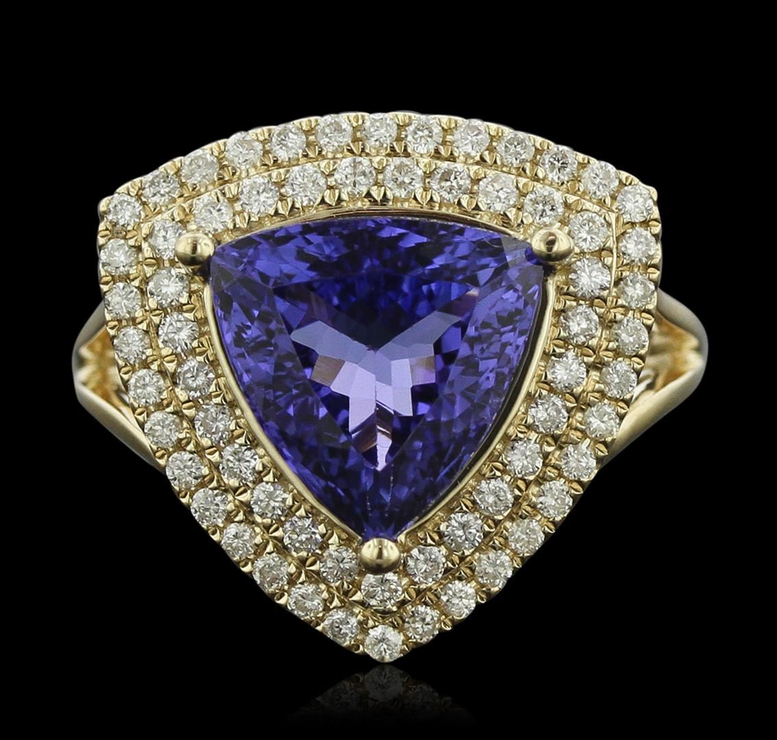 One electronically tested 14KT yellow gold Ladies combination cast & assembled fashion ring with a bright polish finish. Condition is new. Identified with markings of "14K". Containing: One prong set triangle modified mixed cut natural tanzanite, measuring 11.00 x 11.00 x 5.70mm, approximate weight of 4.45ct., clarity is eye clean, type I, medium, moderately strong, bluish violet color, (GIA bV 5/4), cut is very good. Colored gemstones are presumed to have been subjected to commonly used color/clarity enhancement processes. Sixty-Four prong set round brilliant cut diamonds, measuring 1.20 - 1.20 x 0.72mm (depth est.) approximate. Total Weight of 64 Stones = 0.59ct. Clarity: I-1 to I-2. Color: I - J, Cut is Good. Total Weight of Colored Stones 4.45ct. Total Weight of Diamonds 0.59ct. Total Weight of Ring 5.90 grams. GGL Appraised at $9,290.00.