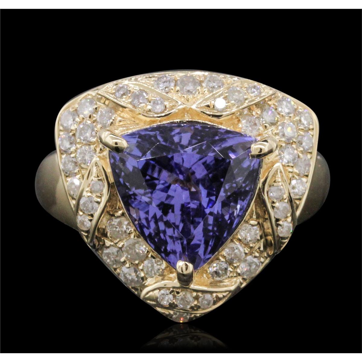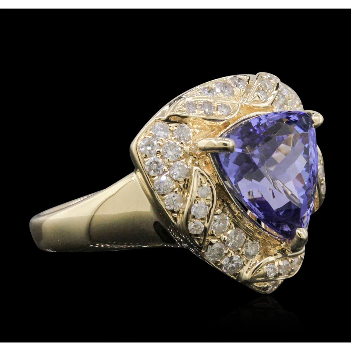 One electronically tested 14KT yellow gold ladies combination cast & assembled tanzanite and diamond ring with a flat shank with a bright polish finish. Identified with markings of "14K". Condition is new. Containing: One prong set triangle modified brilliant cut natural tanzanite, measuring 10.45 x 10.45 x 6.79mm, approximate weight of 4.47ct., clarity is eye clean, type I, medium, very slightly grayish, violet color, (GIA V 5/3), cut is very good. Forty-One prong set round brilliant cut diamonds, measuring 1.50 - 1.20 x 0.81mm (depth est.) approximate total weight of 41 Stones = 0.37ct. Clarity: I-1 to I-2. Color: I - J, Cut is Good. Colored gemstones are presumed to have been subjected to commonly used enhancement processes. All diamonds and colored gemstones are graded in the mounting, unless otherwise stated. Total Weight of Colored Stones 4.47ct. Total Weight of Diamonds 0.37ct. Total Weight of Ring 7.50 grams. GGL Appraised at $9,735.00.