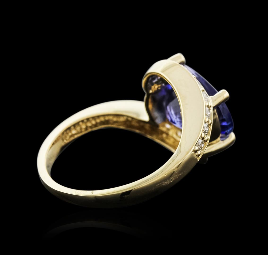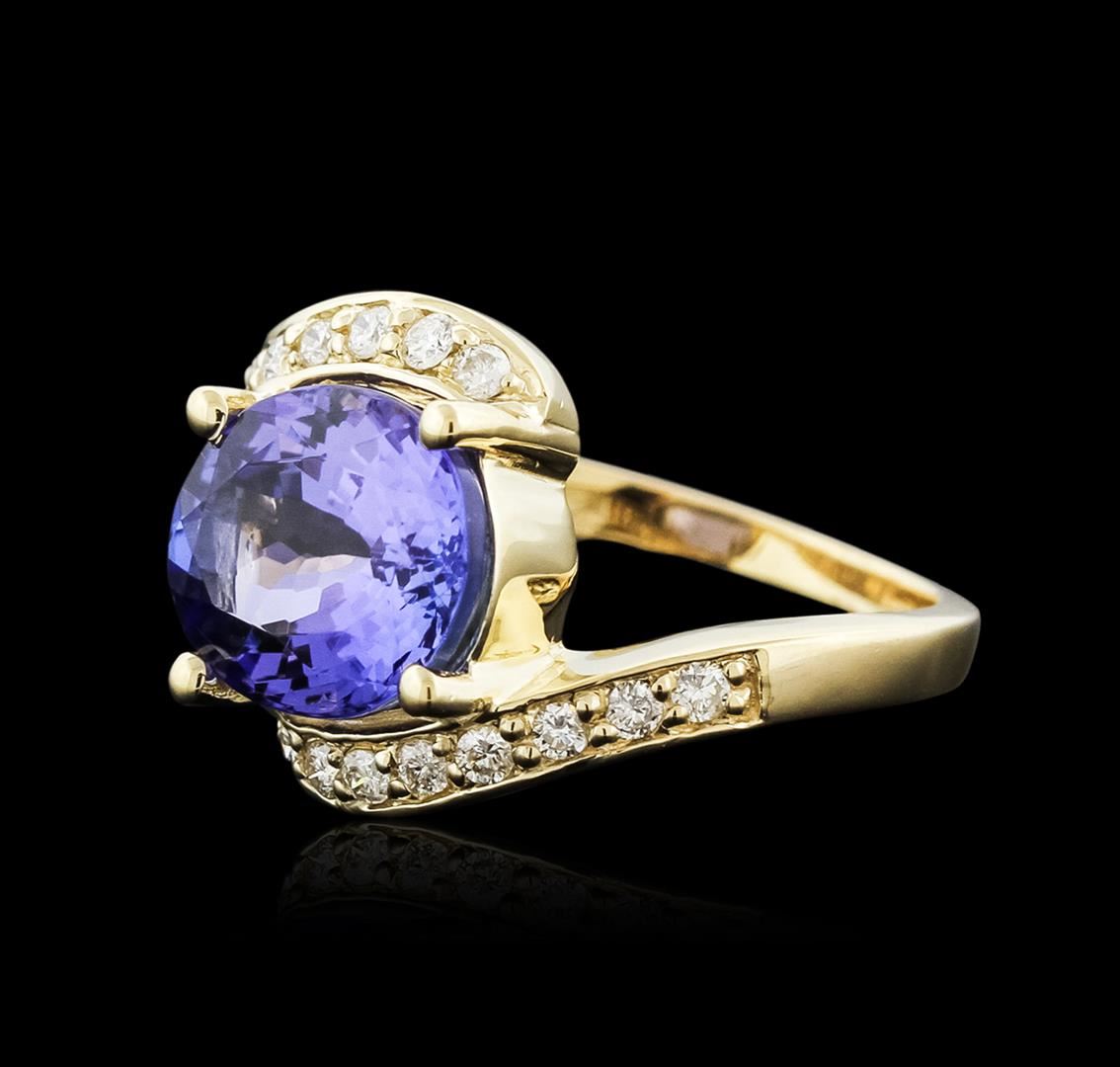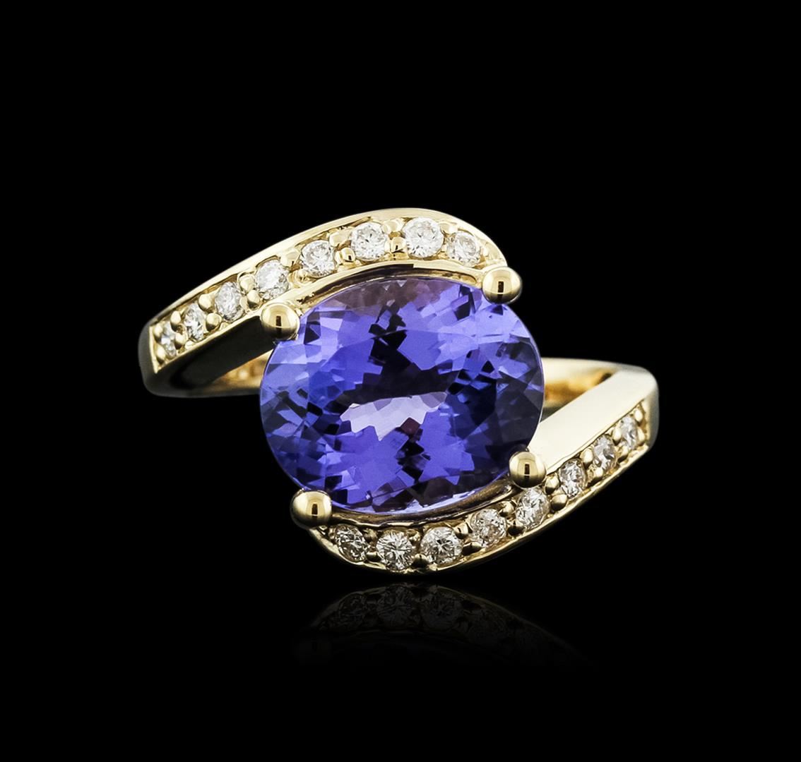One electronically tested 14KT yellow gold ladies cast tanzanite and diamond ring with a bright polish finish. Identified with markings of "14K". Condition is new. Containing: One prong set oval modified brilliant cut natural tanzanite, measuring 11.24 x 9.26 x 6.13mm, approximate weight of 4.49ct., clarity is eye clean, type I, medium light, very slightly grayish, violet color, (GIA V 4/3), cut is good. Sixteen prong set round brilliant cut diamonds, measuring 1.60 - 1.60 x 0.96mm (depth est.) approximate total weight of 16 Stones = 0.24ct. Clarity: SI-2 to I-1. Color: I - J, Cut is Good. Colored gemstones are presumed to have been subjected to commonly used enhancement processes. All diamonds and colored gemstones are graded in the mounting, unless otherwise stated. Total Weight of Colored Stones 4.49ct. Total Weight of Diamonds 0.24ct. Total Weight of Ring 5.30 grams. GGL Appraised at $4,740.00.