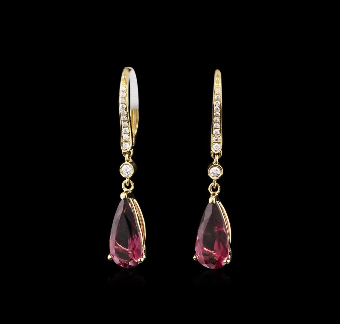 One pair of earrings featuring: 14KT yellow gold weighing 2.87 grams containing two rubellites with a total weight of 4.52ct and 22 round diamonds with a total weight of 0.19ct.