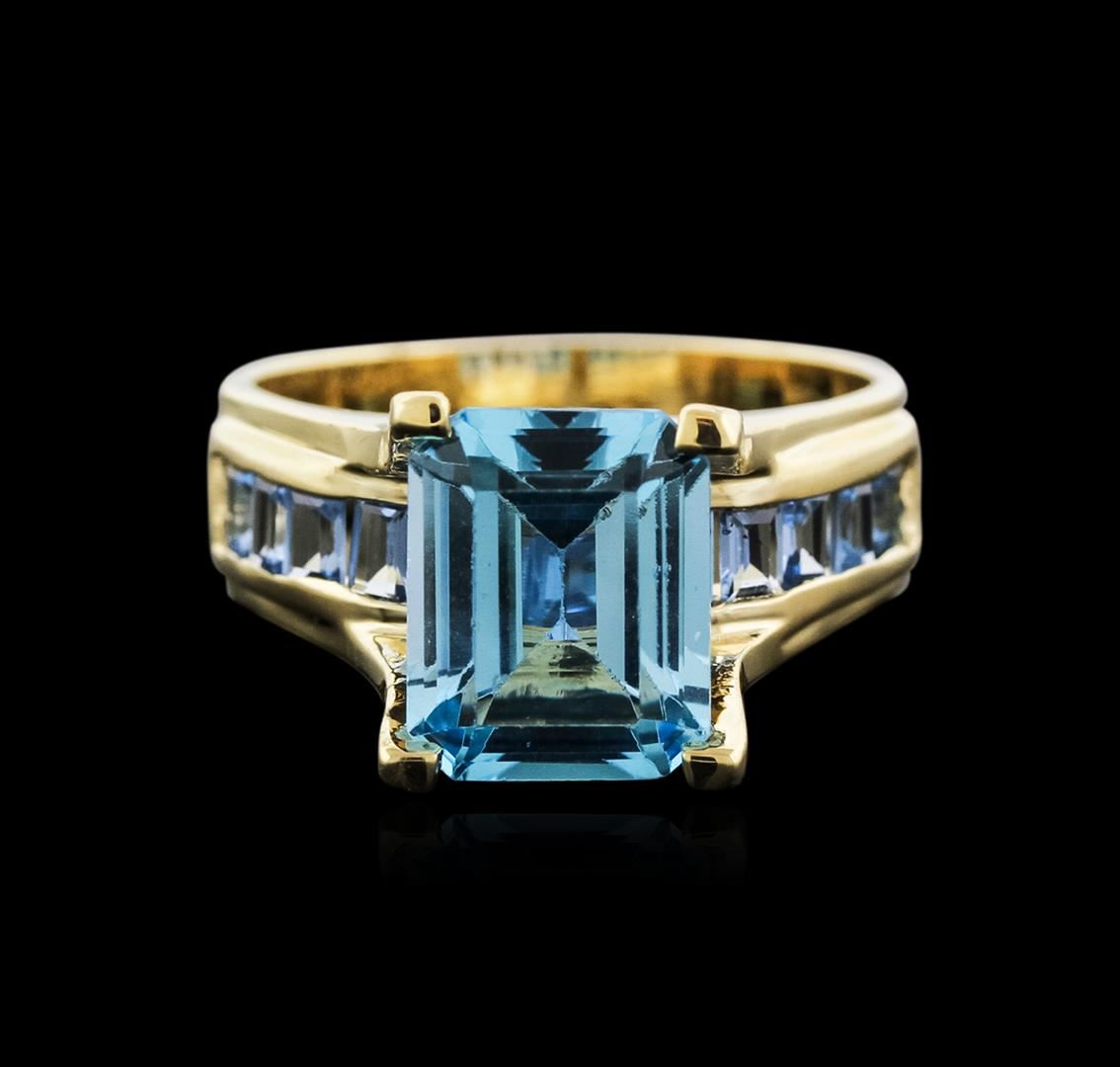 One ring featuring: 14KT yellow gold weighing 5.83 grams containing one blue topaz center weighing 3.79ct and blue topaz side stones weighing a total of 0.75ct.