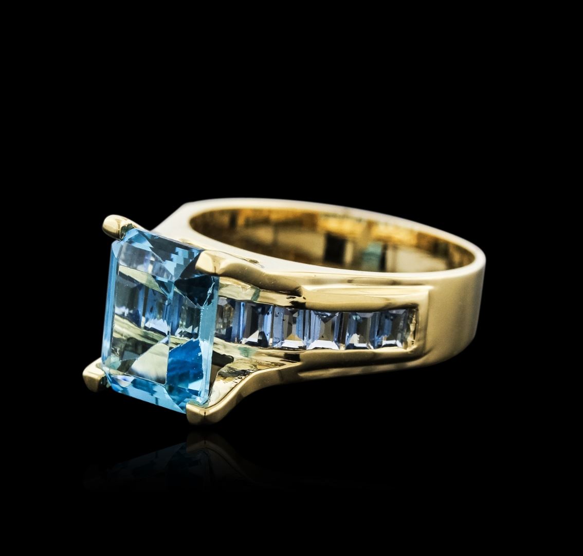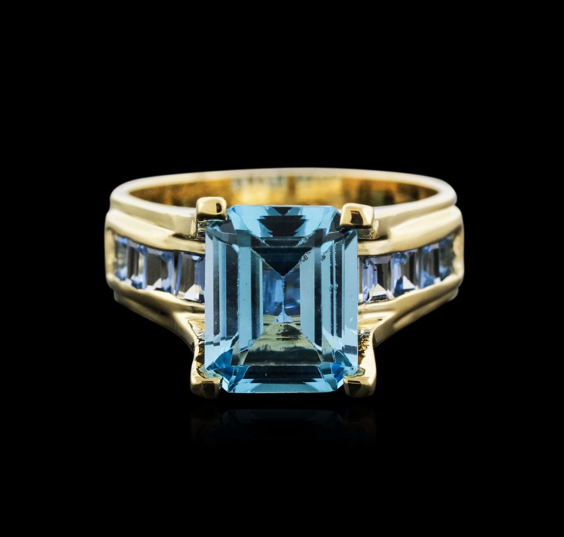 One ring featuring: 14KT yellow gold weighing 5.83 grams containing one blue topaz center weighing 3.79ct and blue topaz side stones weighing a total of 0.75ct.